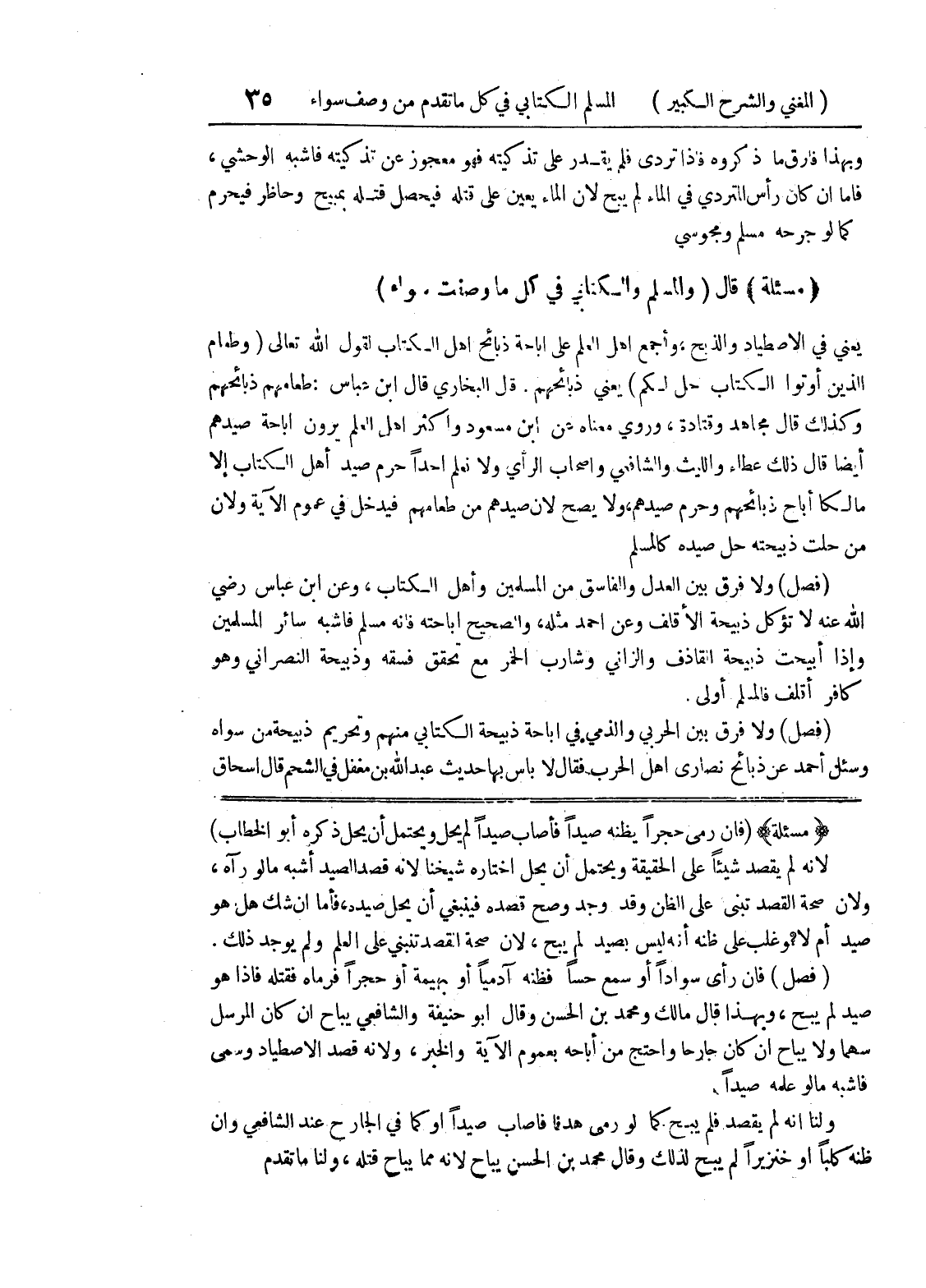 (فصل) فان رأى سواداً أو سمع حساً فظنه آدمياً أو بهيمة أو حجراً فرماه فقتله فإذا هو صيد لم يبح، وبهذا قال مالك ومحمد بن الحسن وقال أبو حنيفة والشافعي يباح أن كان المرسل سهماً ولا يباح أن كان جارحاً واحتج من أباحه بعموم الآية والخبر، ولأنه قصد الاصطياد وسمى فأشبه ما لو علمه صيداً.