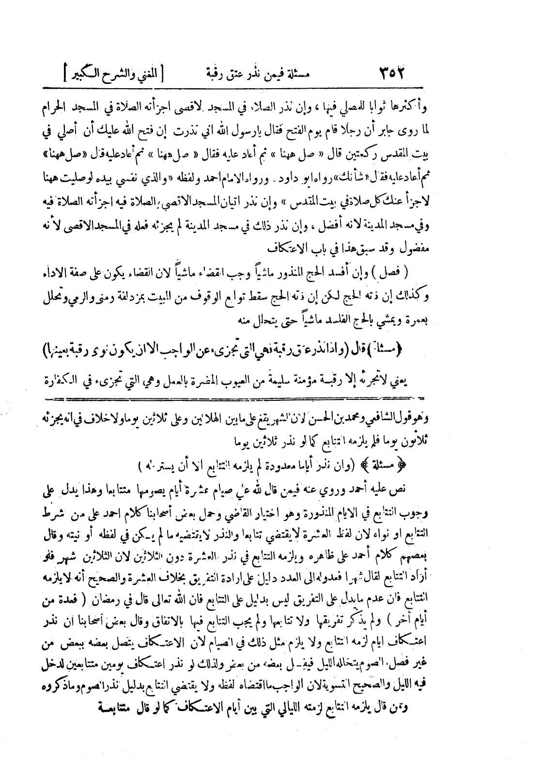 وهو قول الشافعي ومحمد بن الحسن لأن الشهر يقع على ما بين الهلالين وعلى ثلاثين يوما ولا خلاف في أنه يجزئه ثلاثون يوما فلم يلزمه التتابع كما لو نذر ثلاثين يوما * (مسألة) * (وإن نذر أياما معدودة لم يلزمه التتابع الا أن يستر له) نص عليه أحمد وروي عنه فيمن قال لله علي صيام عشرة أيام يصومها متتابعاً وهذا يدل على وجوب التتابع في الأيام المنذورة وهو اختيار القاضي وحمل بعض أصحابنا كلام أحمد على من شرط التتابع أو نواه لأن لفظ العشرة لا يقتضي تتابعاً والنذر لا يقتضيه ما لم يكن في لفظه أو نيته وقال بعضهم كلام أحمد على ظاهره ويلزمه التتابع في نذر العشرة دون الثلاثين لأن الثلاثين شهر فلو أراد التتابع لقال شهراً فعدوله إلى العدد دليل على إرادة التفريق بخلاف العشرة والصحيح أنه لا يلزمه التتابع فإن عدم ما يدل على التفريق ليس بدليل على التتابع فإن الله تعالى قال في رمضان (فعدة من أيام أخر) ولم يذكر تفريقها ولا تتابعها ولم يجب التتابع فيها بالاتفاق وقال بعض أصحابنا أن نذر اعتكاف أيام لزمه التتابع ولا يلزم مثل ذلك في الصيام لأن الاعتكاف يتصل بعضه ببعض من غير فصل الصوم يتخلله الليل فيفل بعضه من بعض ولذلك لو نذر اعتكاف يومين متتابعين لدخل فيه الليل والصحيح التسوية لأن الواجب ما اقتضاه لفظه ولا يقتضي التتابع بدليل نذر الصوم وما ذكروه ومن قال يلزمه التتابع لزمته الليالي التي بين أيام الاعتكاف كما لو قال متتابعه
