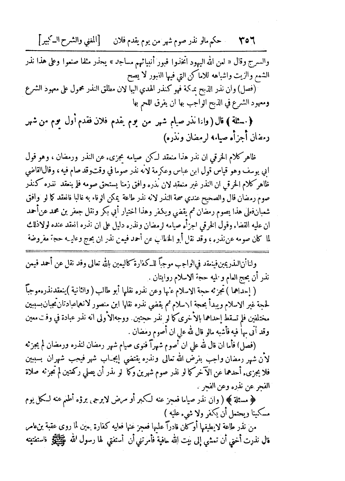 ولنا أن النذر يمين فينعقد في الواجب موجباً للكفارة كاليمين بالله تعالى وقد نقل عن أحمد فيمن نذر أن يحج العام وعليه حجة الإسلام روايتان.
