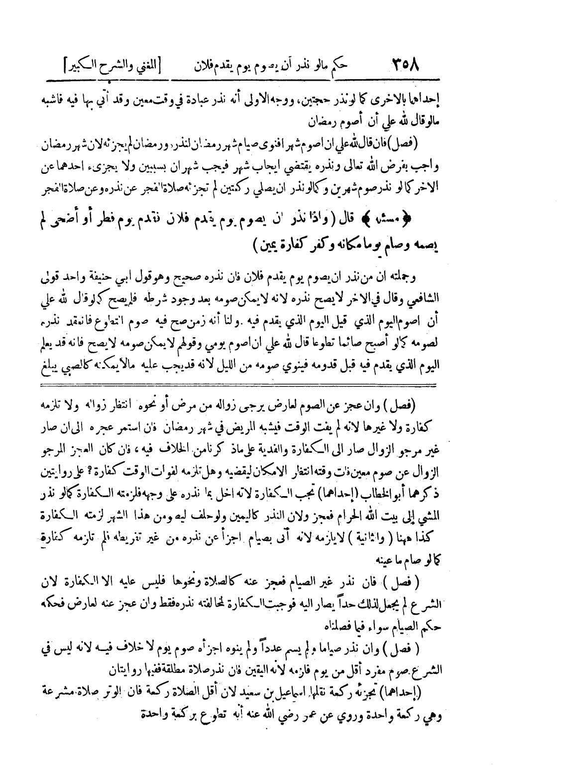 (فصل) وإن عجز عن الصوم لعارض يرجى زواله من مرض أو نحوه انتظر زواله ولا تلزمه كفارة ولا غيرها لأنه لم يفت الوقت فيشبه المريض في شهر رمضان فإن استمر عجزه إلى أن صار غير مرجو الزوال صار إلى الكفارة والفدية على ما ذكرنا من الخلاف فيه، فإن كان العجز المرجو الزوال عن صوم معين فات وقته انتظر الامكان ليقضيه وهل تلزمه لفوات الوقت كفارة، على روايتين ذكرهما أبو الخطاب (إحداهما) تجب الكفارة لاته اخل بما نذره على وجهه فلزمته الكفارة كما لو نذر المشي إلى بيت الله الحرام فعجز ولأن النذر كاليمين ولو حلف ليصومن هذا الشهر لزمته الكفارة كذا ههنا (والثانية) لا يلزمه لأنه أتى بصيام اجزأ عن نذره من غير تفريطه فلم تلزمه كفارة كما لو صام عينه (فصل) فإن نذر غير الصيام فعجز عنه كالصلاة ونحوها فليس عليه الا الكفارة لأن الشرع لم يجعل لذلك حداً يصار إليه فوجبت الكفارة لمخالفته نذره فقط وإن عجز عنه لعارض فحكمه حكم الصيام سواء فيما فصلناه (فصل) وأن نذر صياماً ولم يسم عدداً ولم ينوه اجزأه صوم يوم لا خلاف فيه لأنه ليس في الشرع صوم مفرد أقل من يوم فلزمه لأنه اليقين فإن نذر صلاة مطلقة ففيها روايتان (إحداهما) تجزئه ركعة نقلها اسماعيل بن سعيد لأن أقل الصلاة ركعة فإن الوتر صلاة مشرعة وهي ركعة واحدة وروي عن عمر رضي الله عنه أنه تطوع بركعة واحدة