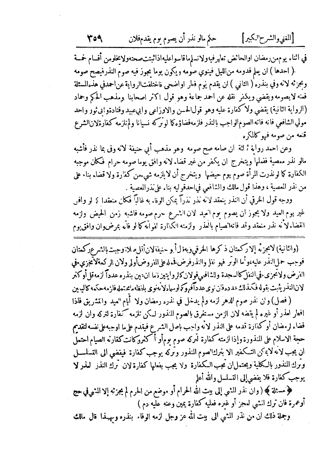 فوجب حمل النذر عليه، وأما الوتر فهو نفل والنذر فرض فحمله على المفروض أولى ولأن الركعة لا تجزئ في الفرض ولا تجزئ في النفل كالسجدة وللشافعي قولان كالروايتين فأما أن عين بنذره عدداً لزمه قل أو كثر لأن النذر يثبت بقوله فكذلك عدده فإن نوى عدداً فهو كما لو سماه لأنه نوى بلفظه ما يحتمله فلزمه حكمه كاليمين (فصل) وإن نذر صوم الدهر لزمه ولم يدخل في نذره رمضان ولا أيام العيد والتشريق فإذا أفطر لعذر أو غيره لم يقضه لأن الزمن مستغرق بالصوم المنذور لكن تلزمه كفارة لتركه وأن لزمه قضاء لرمضان أو كفارة قدمه على النذر لأنه واجب بأصل الشرع فيقدم على ما اوجبه على نفسه لتقديم حجة الاسلام على المنذورة وإذا لزمته كفارة لتركه صوم يوم أو أكثر وكانت كفارته الصيام احتمل أن يجب لأنه لا يمكن التكفير الا بترك الصوم المنذور وتكره يوجب كفارة فيفضي إلى التسلسل وترك المنذور بالكلية ويحتمل أن تجب الكفارة ولا يجب بفعلها كفارة لأن ترك النذر لعذر لا يوجب كفارة فلا يفضي إلى التسلسل والله أعلم * (مسألة) * (وإن نذر المشي إلى بيت الله الحرام أو موضع من الحرم لم يجزئه إلا المشي في حج أو عمرة فإن ترك المشي لعجز أو غيره فعليه كفارة يمين وعنه عليه دم) وجملة ذلك أن من نذر المشي إلى بيت الله عزوجل لزمه الوفاء بنذره وبهذا قال مالك