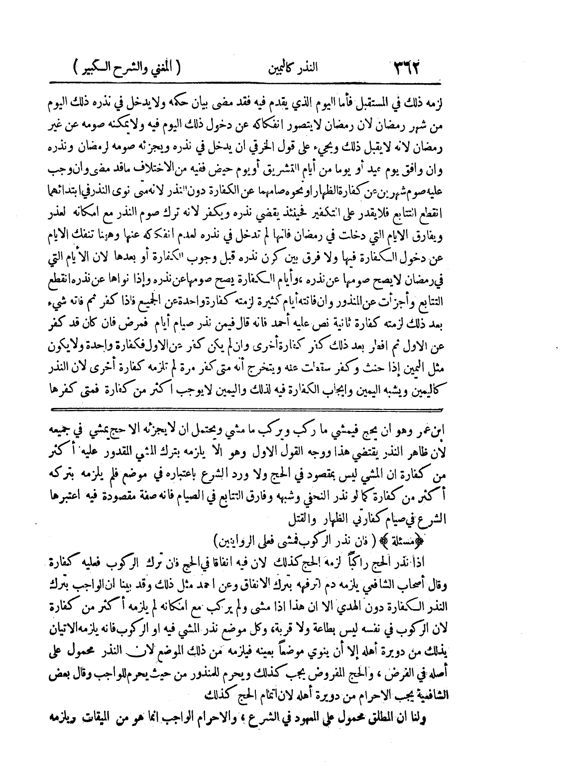 لأن ظاهر النذر يقتضي هذا ووجه القول الأول وهو ألا يلزمه بترك المشي المقدور عليه أكثر من كفارة أن المشي ليس بمقصود في الحج ولا ورد الشرع باعتباره في موضع فلم يلزمه بتركه أكثر من كفارة كما لو نذر النحفي وشبهه وفارق التتابع في الصيام فإنه صفة مقصودة فيه اعتبرها الشرع في صيام كفارتي الظهار والقتل * (مسألة) * (فإن نذر الركوب فمشى فعلى الروايتين) إذا نذر الحج راكباً لزمه الحج كذلك لأن فيه انفاقاً في الحج فإن ترك الركوع فعليه كفارة وقال أصحاب الشافعي يلزمه دم لترفهه بترك الإنفاق وعن أحمد مثل ذلك وقد بينا أن الواجب بترك النذر الكفارة دون الهدي إلا أن هذا إذا مشى ولم يركب مع إمكانه لم يلزمه أكثر من كفارة لأن الركوب في نفسه ليس بطاعة ولا قربة، وكل موضع نذر المشي فيه أو الركوب فإنه يلزمه الإتيان بذلك من ديرة أهله إلا أن ينوي موضعاً بعينه فيلزمه من ذلك الموضع لأن النذر محمول على اصله في الفرض، والحج المفروض يجب كذلك ويحرم للمنذور من حيث يحرم للواجب وقال بعض الشافعية يجب الإحرام من دويرة أهله لأن إتمام الحج كذلك ولنا أن المطلق محمول على المعهود في الشرع، والإحرام الواجب إنما هو من الميقات ويلزمه