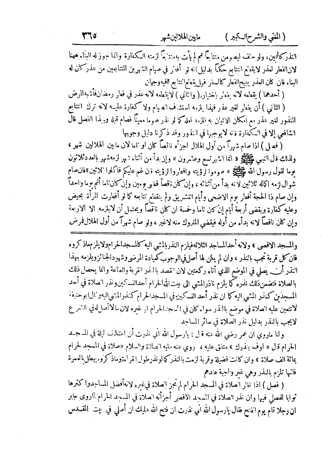 والمسجد الأقصى " ولأنه أحد المساجد الثلاثة فيلزم النذر بالمشي إليه كالمسجد الحرام ولا يلزم ما ذكروه فإن كان قربة تجب بالنذر، وإن لم يكن لها أصل في الوجوب كعيادة المرضى وشهود الجنائز ويلزمه بهذا النذر أن يصلي في الموضع الذي أتاه ركعتين لأن القصد بالنذر القربة والطاعة وإنما يحصل ذلك بالصلاة فتضمن ذلك نذره كما يلزم ناذر المشي إلى بيت الله الحرام أحد النسكين ونذر الصلاة في أحد المسجدين كنذر المشي إليه كما أن نذر أحد النسكين في المسجد الحرام كنذر المشي وقال أبو حنيفة لا تتعين عليه الصلاة في موضع بالنذر سواء كان في المسجد الحرام أو غيره لأن مالا أصل له في الشرع لا يجب بالنذر بدليل نذر الصلاة في سائر المساجد ولنا ما روى أن عمر رضي الله عنه قال: يا رسول الله إني نذرت إن أعتكف ليلة في المسجد الحرام قال " أوف بنذرك " متفق عليه، روى عنه عليه الصلاة والسلام " صلاة في المسجد الحرام بمائة ألف صلاة " وإن كانت فضيلة وقربة لزمت بالنذر كما لو نذر طول القراءة وما ذكروه ويبطل بالعمرة فإنها تلزم بالنذر وهي غير واجبة عندهم (فصل) إذا نظر الصلاة في المسجد الحرام لم تجز الصلاة في غيره لأنه أفضل المساجد واكثرها ثوابا للمصلي فيها وإن نذر الصلاة في المسجد الأقصى اجزأته الصلاة في المسجد الحرام لما روى جابر أن رجلاً قام يوم الفتح فقال يا رسول الله إني نذرت إن فتح الله عليك أن أصلي في بيت المقدس