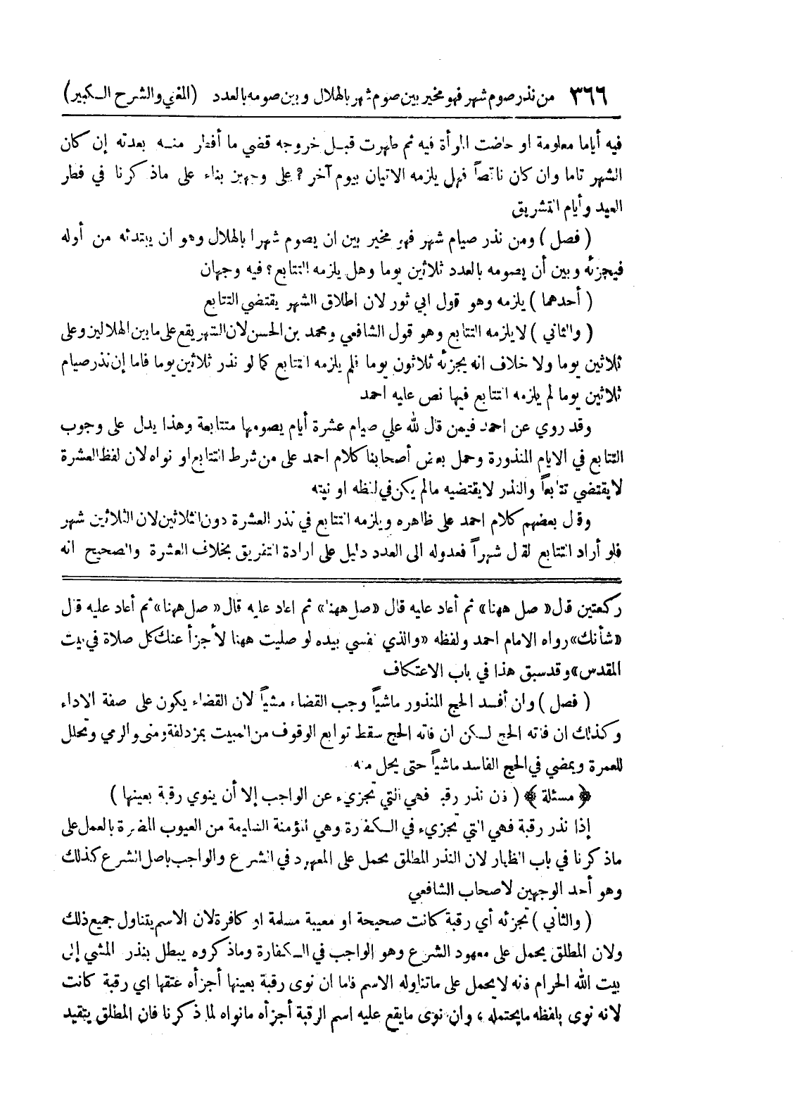 ركعتين قال " صل ههنا " ثم اعاد عليه قال " صل ههنا " ثم اعاد عليه قال " صل ههنا " ثم اعاد عليه قال " شأنك " رواه الإمام أحمد ولفظه " والذي نفسي بيده لو صليت ههنا لأجزأ عنك كل صلاة في بيت المقدس " وقد سبق هذا في باب الاعتكاف (فصل) وإن أفسد الحج المنذور ماشياً وجب القضاء مشياً لأن القضاء يكون على صفة الأداء وكذلك إن فاته الحج لكن إن فاته الحج سقط توابع الوقوف من المبيت بمزدلفة ومنى والرمي وتحلل للعمرة ويمضي في الحج الفاسد ماشياً حتى يحل منه * (مسألة) * (فإن نذر رقبة فهي التي تجزئ عن الواجب إلا أن ينوي رقبة بعينها)