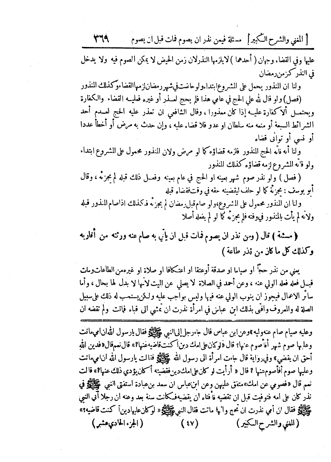 وعليه صيام صام عنه وليه " وعن ابن عباس قال جاء رجل إلى النبي صلى الله عليه وسلم فقال يا رسول الله إن أمي ماتت وعليها صوم شهر أفأصوم عنها؟ قال " لو كان على أمك دين أكنت قاضيه عنها؟ " قال نعم قال " فدين الله أحق أن يقضى " وفي رواية قال جاءت امرأة إلى رسول الله صلى الله عليه وسلم فقالت يا رسول الله إن أمي ماتت وعليها صوم أفأصوم عنها؟ قال " أرأيت لو كان على أمك دين فقضيته أكان يؤدي ذلك عنها؟ " قالت نعم قال " فصومي عن أمك " متفق عليهن وعن ابن عباس أن سعد بن عبادة استفتى النبي صلى الله عليه وسلم في نذر كان على أمه فتوفيت قبل أن تقضيه فأفتاه إن يقضيه فكانت سنة بعد وعنه أن رجلاً أتى النبي صلى الله عليه وسلم فقال إن أمي نذرت أن تحج وإنها ماتت فقال النبي صلى الله عليه وسلم " لو كان عليها دين أكنت قاضيه؟ "