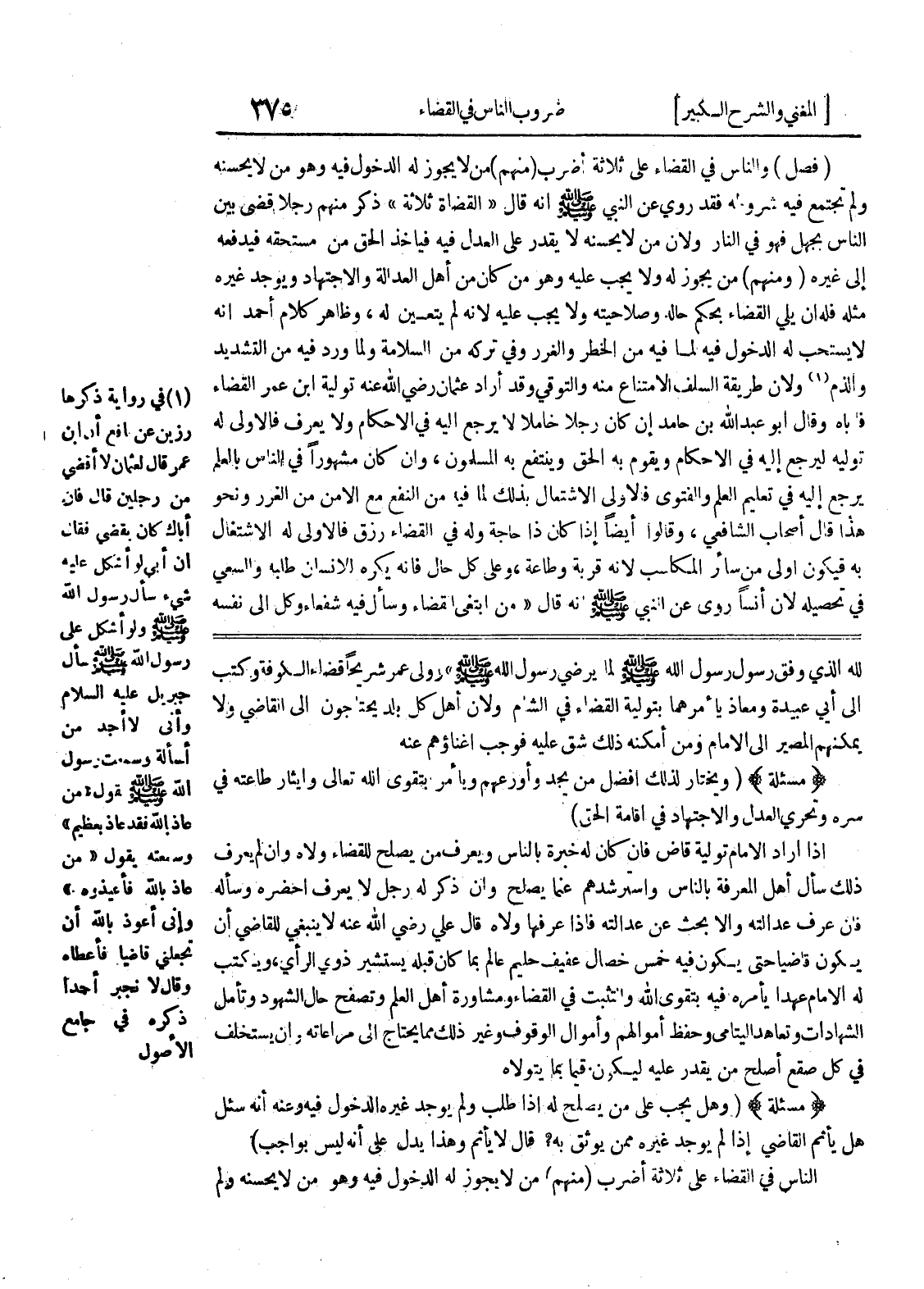 لله الذي وفق رسول رسول الله صلى الله عليه وسلم لما يرضي رسول الله صلى الله عليه وسلم " وولى عمر شريحا قضاء الكوفة وكتب إلى أبي عبيدة ومعاذ يأمرهما بتولية القضاء في الشام ولأن أهل كل بلد يتحاجون إلى القاضي ولا يمكنهم المصير إلى الإمام ومن أمكنه ذلك شق عليه فوجب اغناؤهم عنه * (مسألة) * (ويختار لذلك أفضل من يجد وأورعهم ويأمر بتقوى الله تعالى وإيثار طاعته في سره وتحري العدل والاجتهاد في إقامة الحق) إذا أراد الإمام تولية قاض فإن كان له خبرة بالناس ويعرف من يصلح للقضاء ولاه وإن لم يعرف ذلك سأل أهل المعرفة بالناس واسترشدهم عنما يصلح وإن ذكر له رجل لا يعرف احضره وسأله فإن عرف عدالته وإلا بحث عن عدالته فإذا عرفها ولاه قال علي رضي الله عنه لا ينبغي للقاضي أن يكون قاضياً حتى يكون فيه خمس خصال عفيف حليم عالم بما كان قبله يستشير ذوي الرأي، ويكتب له الإمام عهداً يأمره فيه بتقوى الله والتثبت في القضاء ومشاورة أهل العلم وتصفح حال الشهود وتأمل الشهادات وتعاهد اليتامى وحفظ أموالهم وأموال الوقوف وغير ذلك مما يحتاج إلى مراعاته وإن يستخلف في كل صقع أصلح من يقدر عليه ليكون قيما بما يتولاه * (مسألة *) (وهل يجب على من يصلح له إذا طلب ولم يوجد غيره الدخول فيه وعنه أنه سئل هلى يأثم القاضي إذا لم يوجد غيره ممن يوثق به؟ قال لا يأثم وهذا يدل على أنه ليس بواجب) الناس في القضاء على ثلاثة أضرب (منهم) من لا يجوز له الدخول فيه وهو من لا يحسنه ولم