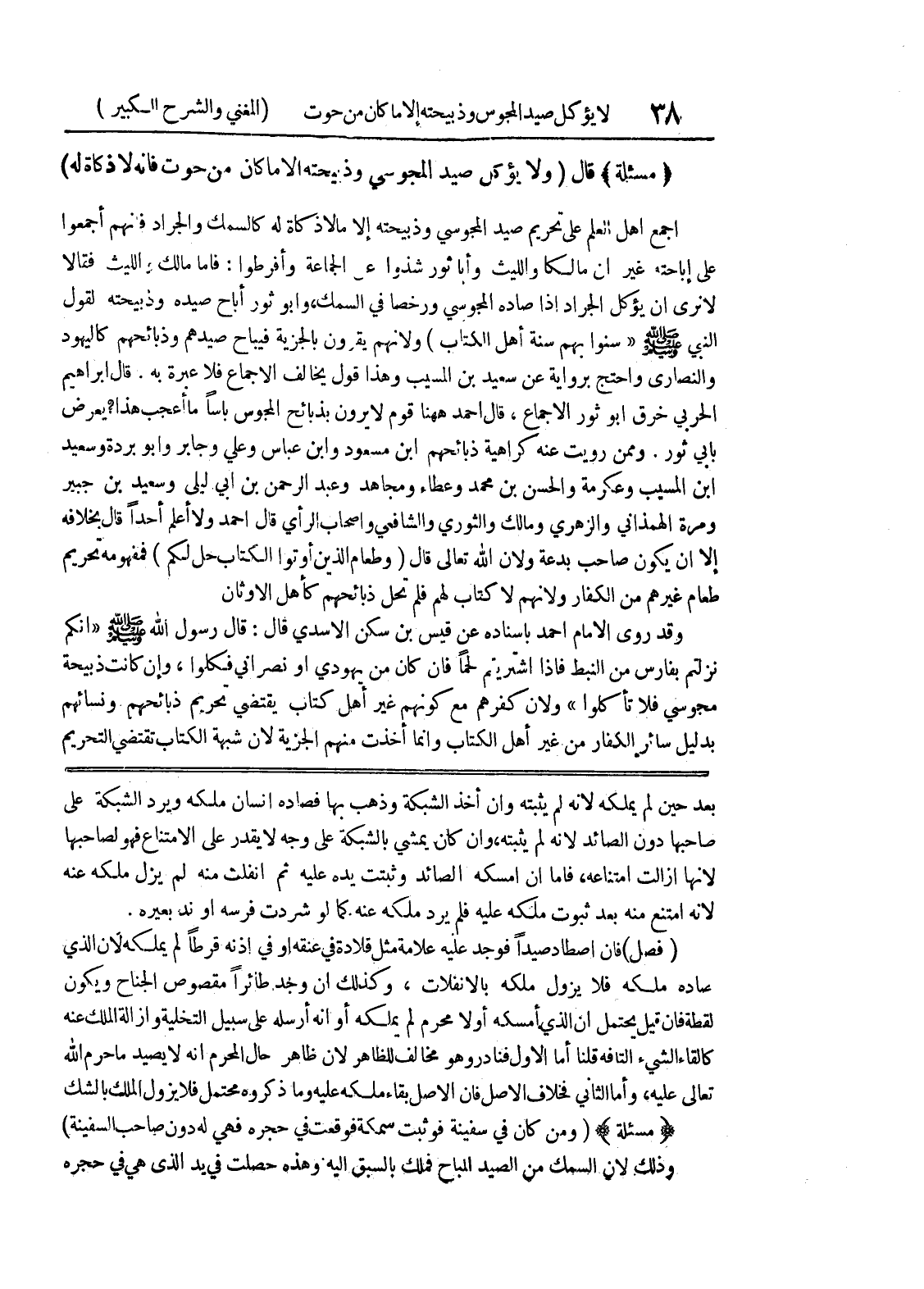 (فصل) فإن اصطاد صيداً فوجد عليه علامة مثل قلادة في عنقه أو في أذنه قرطاً لم يملكه لأن الذي صاده ملكه فلا يزول ملكه بالانفلات، وكذلك إن وجد طائراً مقصوص الجناح ويكون لقطة فإن قيل يحتمل أن الذي أمسكه أولاً محرم لم يملكه أو أنه أرسله على سبيل التخلية وإزالة الملك عنه كالقاء الشئ التافه قلنا أما الأول فنادر وهو مخالف للظاهر لأن ظاهر حال المحرم أنه لا يصيد ما حرم الله تعالى عليه، وأما الثاني فخلاف الأصل فإن الأصل بقاء ملكه عليه وما ذكروه محتمل فلا يزول الملك بالشك * (مسألة) * (ومن كان في سفينة فوثبت سمكة فوقعت في حجره فهي له دون صاحب السفينة) وذلك لأن السمك من الصيد المباح فملك بالسبق إليه وهذه حصلت في يد الذي هي في حجره