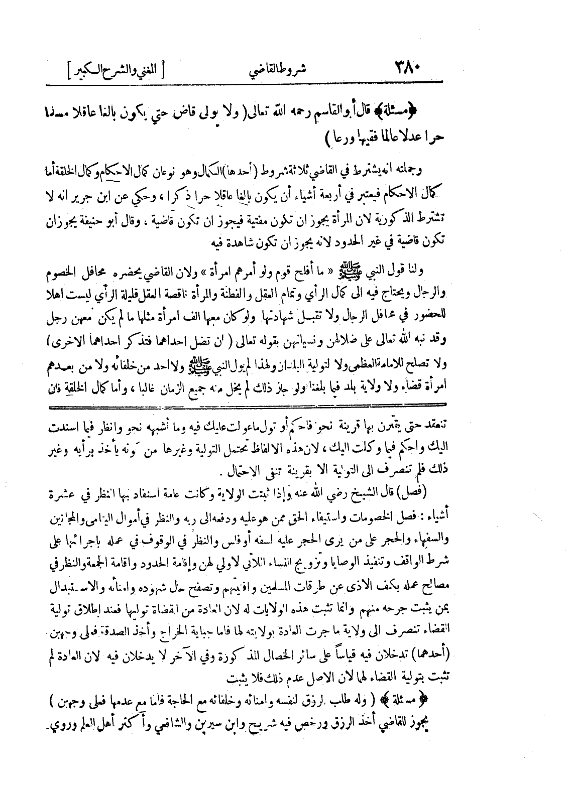 (فصل) قال الشيخ رضي الله عنه وإذا ثبتت الولاية وكانت عامة اسنفاد بها النظر عشرة أشياء: فصل الخصومات واستيفاء الحق ممن هو عليه ودفعه إلى ربه والنظر في أموال اليتامى والمجانين والسفهاء والحجر على من يرى الحجر عليه لسفه أو فلس والنظر في الوقوف في عمله باجرائها على شرط الواقف وتنفيذ الوصايا وتزويج النساء اللاتي لا ولي لهن وإقامة الحدود وإقامة الجمعة والنظر في مصالح عمله بكف الأذى عن طرقات المسلمين وافنيتهم وتصفح حال شهوده وأمنائه والاستبدال بمن يثبت جرحه منهم وإنما تثبت هذه الولايات له لأن العادة من القضاة توليها فعند إطلاق تولية القضاء تنصرف إلى ولاية ما جرت العادة بولايته لها فأما جباية الخراج وأخذ الصدقة فعلى وجهين (أحدهما) تدخلان فيه قياساً على سائر الخصال المذكورة وفي الآخر لا يدخلان فيه لأن العادة لم تثبت بتولية القضاء لهما لأن الأصل عدم ذلك فلا يثبت * (مسألة) * (وله طلب الرزق لنفسه وأمنائه وخلفائه مع الحاجة فأما مع عدمها فعلى وجهين) يجوز للقاضي أخذ الرزق ورخص فيه شريح وابن سيرين والشافعي وأكثر أهل العلم وروي