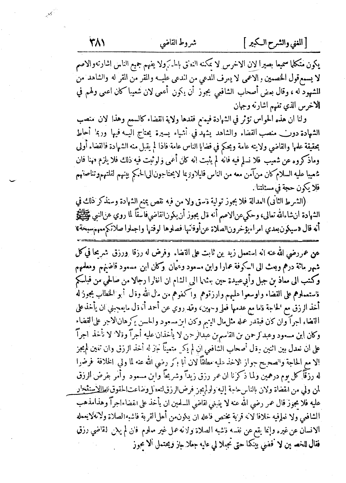 عن عمر رضي الله عنه أنه استعمل زيد بن ثابت على القضاء وفرض له رزقا ورزق شريحاً في كل شهر مائة درهم وبعث إلى الكوفة عماراً وابن مسعود وعثمان وكان ابن مسعود قاضيهم ومعلمهم وكتب إلى معاذ بن جبل وأبي عبيدة حين بعثهما إلى الشام ان انظرا رجالاً من صالحي من قبلكم فاستعملوهم على القضاء واوسعوا عليهم وارزقوهم واكفوهم من مال الله وقال أبو الخطاب يجوز له أخذ الرزق مع الحاجة فأما مع عدمها فعلى وجهين، وقد روي عن أحمد أنه قال ما يعجبني أن يأخذ على القضاء أجراً وإن كان فبقدر عمله مثل مال اليتيم وكان ابن مسعود والحسن يكرهان الأجر على القضاء وكان ابن مسعود وعبد الرحمن بن القاسم بن عبد الرحمن لا يأخذان عليه أجراً وقالا لا نأخذ أجراً على أن نعدل بين اثنين وقال أصحاب الشافعي إن لم يكن متعيناً جاز له أخذ الرزق وإن تعين لم يجز إلا مع الحاجة والصحيح جواز الأخذ عليه مطلقاً لأن أبا بكر رضي الله عنه لما ولي الخلافة فرضوا له رزقاً كل يوم درهمين ولما ذكرنا أن عمر رزق زيدا وشريحا وابن مسعود وأمر بفرض الرزق