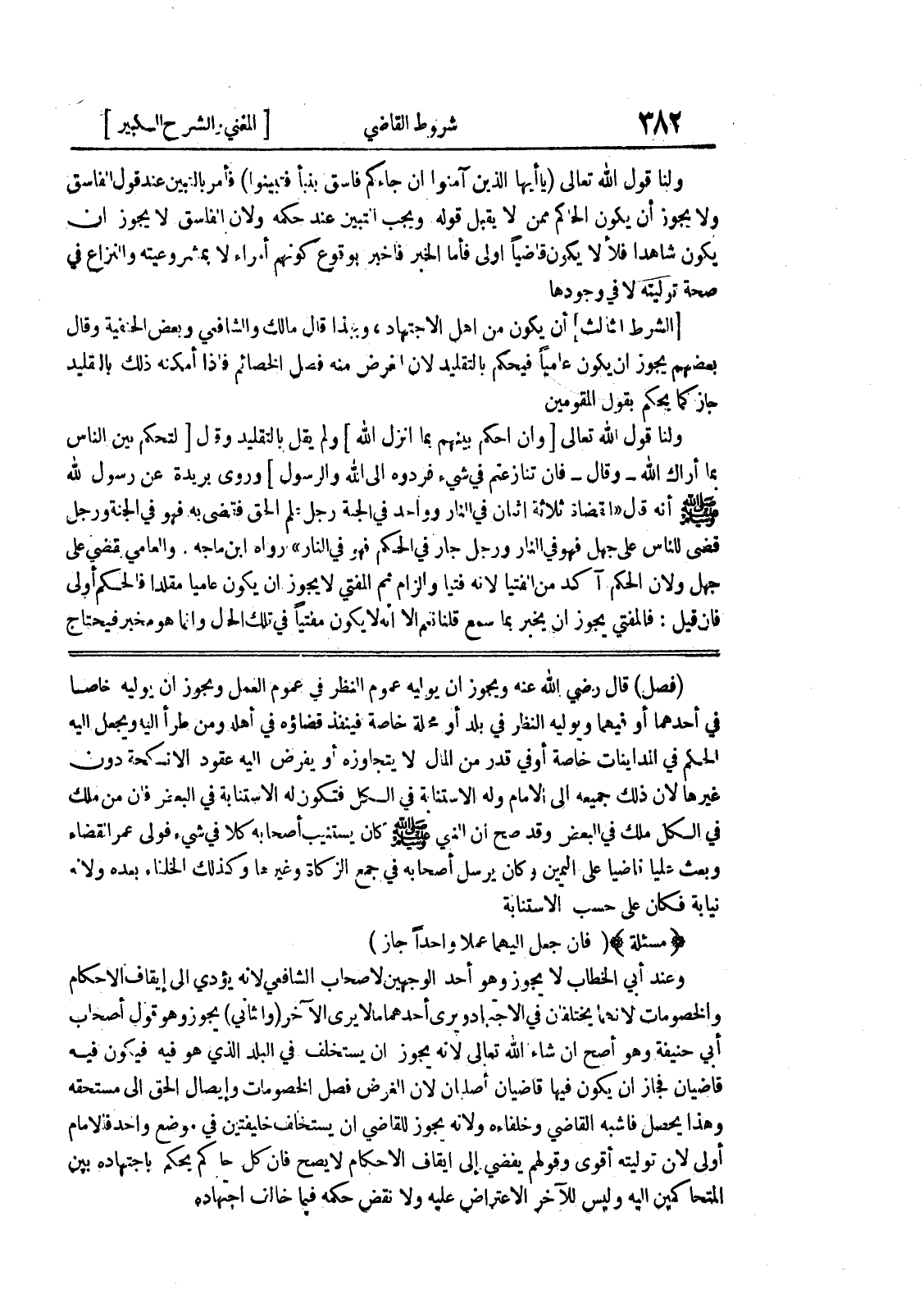 (فصل) قال رضي الله عنه ويجوز أن يوليه عموم النظر في عموم العمل ويجوز أن يوليه خاصا في أحدهما أو فيهما ويوليه النظر في بلد أو محلة خاصة فينفذ قضاؤه في أهله ومن طرأ إليه ويجعل إليه الحكم في المداينات خاصة أو في قدر من المال لا يتجاوزه أو يفرض إليه عقود الأنكحة دون غيرها لأن ذلك جميعه إلى الإمام وله الاستنابة في الكل فتكون له الاستنابة في البعض فإن من ملك في الكل ملك في البعض وقد صح أن النبي صلى الله عليه وسلم كان يستنيب أصحابه كلا في شئ فولى عمر القضاء وبعث عليا قاضيا على اليمين وكان يرسل أصحابه في جمع الزكاة وغيرها وكذلك الخلفاء بعده ولأنه نيابة فكان على حسب الاستنابة * (مسألة) * (فإن جعل إليهما عملا واحداً جاز) وعند أبي الخطاب لا يجوز وهو أحد الوجهين لأصحاب الشافعي لأنه يؤدي إلى إيقاف الأحكام والخصومات لأنهما يختلفان في الاجتهاد ويرى أحدهما مالا يرى الآخر (والثاني) يجوز وهو قول أصحاب أبي حنيفة وهو أصح إن شاء الله تعالى لأنه يجوز أن يستخلف في البلد الذي هو فيه فيكون فيه قاضيان فجاز أن يكون فيها قاضيان أصلبان لأن الغرض فصل الخصومات وإيصال الحق إلى مستحقه وهذا يحصل فأشبه القاضي وخلفاءه ولأنه يجوز للقاضي أن يستخلف خليفتين في موضع واحد فالإمام أولى لأن توليته أقوى وقولهم يفضي إلى إيقاف الأحكام لا يصح فإن كل حاكم يحكم بإجتهاده بين المتحاكمين إليه وليس للآخر الاعتراض عليه ولا نقض حكمه فيما خالف اجتهاده