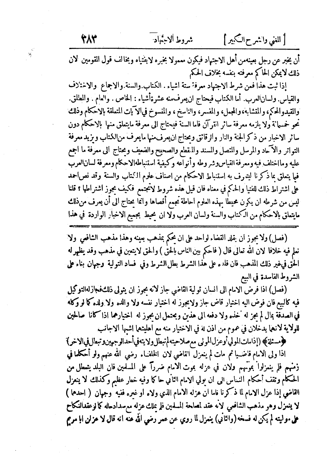 (فصل) ولا يجوز أن يقلد القضاء لواحد على أن يحكم بمذهب بعينه وهذا مذهب الشافعي ولا نعلم فيه خلافاً لأن الله تعالى قال (فاحكم بين الناس بالحق) والحق لا يتعين في مذهب وقد يظهر له الحق في غير ذلك المذهب فإن قلده على هذا الشرط بطل الشرط وفي فساد التولية وجهان بناء على الشروط الفاسدة في البيع (فصل) إذا فرض الإمام إلى إنسان تولية القاضي جاز لأنه يجوز أن يتولى ذلك فجاز له التوكيل فيه كالبيع فإن فوض إليه اختيار قاض جاز ولا يجوز له اختيار نفسه ولا والده ولا ولده كما لو وكله في الصدقة بمال لم يجز له اخذه ولا دفعه إلى هذين ويحتمل أن يجوز له اختيارهما إذا كانا صالحين للولاية لأنهما يدخلان في عموم من أذن له في الاختيار منه مع أهليتهما أشبها الأجانب * (مسألة) * (إذا مات المولي أو عزل المولى مع صلاحيته لم تبطل ولايته في أحد الوجهين وتبطل في الآخر) إذا ولى الإمام قاضياً ثم مات لم ينعزل القاضي لأن الخلفاء رضي الله عنهم ولو أحكاما في زمنهم فلم ينعزلوا بموتهم ولأن في عزله بموت الامام ضربرا على المسلمين فإن البلد يتعطل من الحكام وتقف أحكام الناس إلى أن يولي الإمام الثاني حاكما وفيه خطر عظيم وكذلك لا ينعزل القاضي إذا عزل الإمام لما ذكرنا فأما إن عزله الإمام الذي ولاه أو غيره ففيه وجهان (أحدهما) لا ينعزل وهو مذهب الشافعي لأنه عقد لمصلحة المسلمين فلم يملك عزله مع سداد حاله كما لو عقد النكاح على موليته لم يكن له فسخه (والثاني) ينعزل لما روي عن عمر رضي الله عنه أنه قال لأعزلن أبا مريم