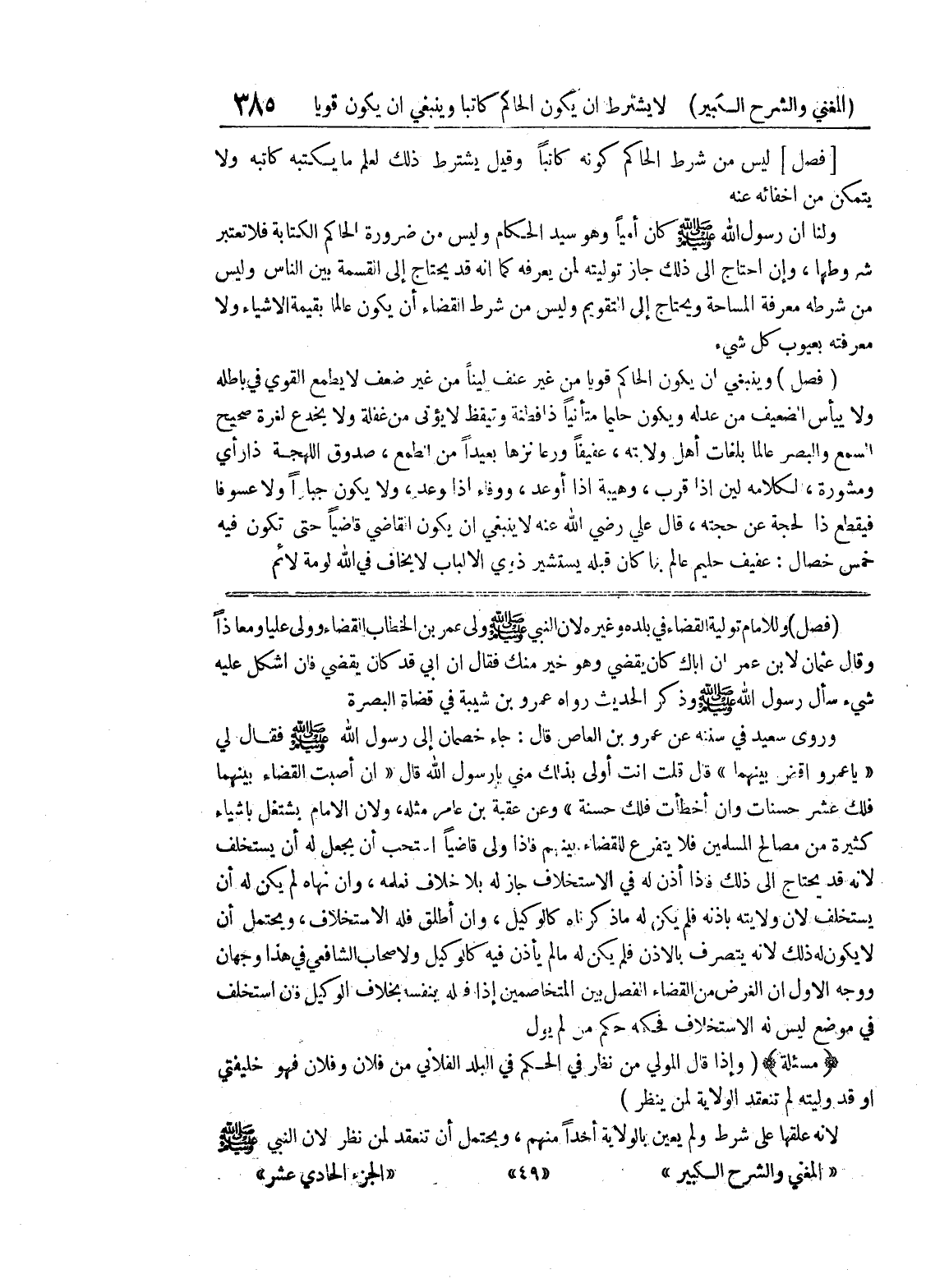 (فصل) وللإمام تولية القضاء في بلده وغيره لأن النبي صلى الله عليه وسلم ولى عمر بن الخطاب القضاء وولى علياً ومعاذاً وقال عثمان لابن عمر إن أباك كان يقضي وهو خير منك فقال إن أبي قد كان يقضي فإن اشكل عليه شئ سأل رسول الله صلى الله عليه وسلم وذكر الحديث رواه عمرو بن شيبة في قضاة البصرة وروى سعيد في سننه عن عمرو بن العاص قال: جاء خصمان إلى رسول الله صلى الله عليه وسلم فقال لي " يا عمرو اقض بينهما " قال قلت أنت أولى بذلك مني يا رسول الله قال " إن أصبت القضاء بينهما فلك عشر حسنات وإن أخطأت فلك حسنة " وعن عقبة بن عامر مثله، ولأن الإمام يشتغل بأشياء كثيرة من مصالح المسلمين فلا يتفرع للقضاء بينهم فإذا ولى قاضياً استحب أن يجعل له أن يستخلف لأنه قد يحتاج إلى ذلك فإذا أذن له في الاستخلاف جاز له بلا خلاف نعلمه، وإن نهاه لم يكن له أن يستخلف لأن ولايته بإذنه فلم يكن له ما ذكرناه كالوكيل، وإن أطلق فله الاستخلاف، ويحتمل أن لا يكون له ذلك لأنه يتصرف بالإذن فلم يكن له ما لم يأذن فيه كالوكيل ولأصحاب الشافعي في هذا وجهان ووجه الأول أن الغرض من القضاء الفصل بين المتخاصمين إذا فعله بنفسه بخلاف الوكيل فإن استخلف في موضع ليس له الاستخلاف فحكمه حكم من لم يول * (مسألة) * (وإذا قال المولي من نظر في الحكم في البلد الفلاني من فلان وفلان فهو خليفتي