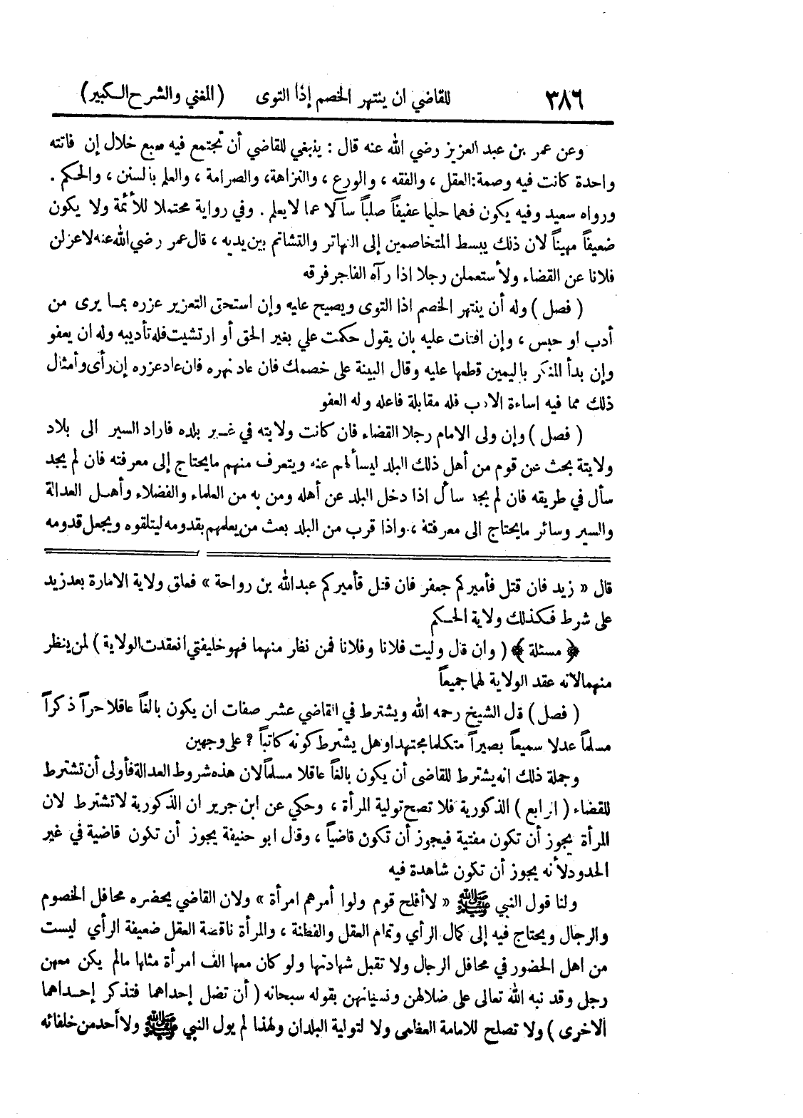 قال " زيد فإن قتل فأميركم جعفر فإن قتل فأميركم عبد الله بن رواحة " فعلق ولاية الامارة بعد زيد على شرط فكذلك ولاية الحكم * (مسألة) * (وإن قال وليت فلانا وفلانا فمن نظر منهما فهو خليفتي انعقدت الولاية) لمن ينظر منهما لأنه عقد الولاية لهما جميعاً (فصل) قال الشيخ رحمه الله ويشترط في القاضي عشر صفات أن يكون بالغاً عاقلاً حراً ذكراً مسلماً عدلا سميعا بصير متكلماً مجتهداً وهل يشترط كونه كاتباً؟ على وجهين وجملة ذلك أنه يشترط للقاضي أن يكون بالغاً عاقلاً مسلماً لأن هذه شروط العدالة فأولى أن تشترط للقضاء (الرابع) الذكورية فلا تصح تولية المرأة، وحكي عن ابن جرير أن الذكورية لا تشترط لأن المرأة يجوز أن تكون مفتية فيجوز أن تكون قاضياً، وقال أبو حنيفة يجوز أن تكون قاضية في غير الحدود لأنه يجوز أن تكون شاهدة فيه ولنا قول النبي صلى الله عليه وسلم " لا أفلح قوم ولوا أمرهم امرأة " ولأن القاضي يحضره محافل الخصوم والرجال ويحتاج فيه إلى كمال الرأي وتمام العقل والفطنة، والمرأة ناقصة العقل ضعيفة الرأي ليست من أهل الحضور في محافل الرجال ولا تقبل شهادتها ولو كان معها ألف امرأة مثلها ما لم يكن معهن رجل وقد نبه الله تعالى على ضلالهن ونسيانهن بقوله سبحانه (أن تضل إحداهما فتذكر إحداهما الأخرى) ولا تصلح للإمامة العظمى ولا لتولية البلدان ولهذا لم يول النبي صلى الله عليه وسلم ولا أحد من خلفائه