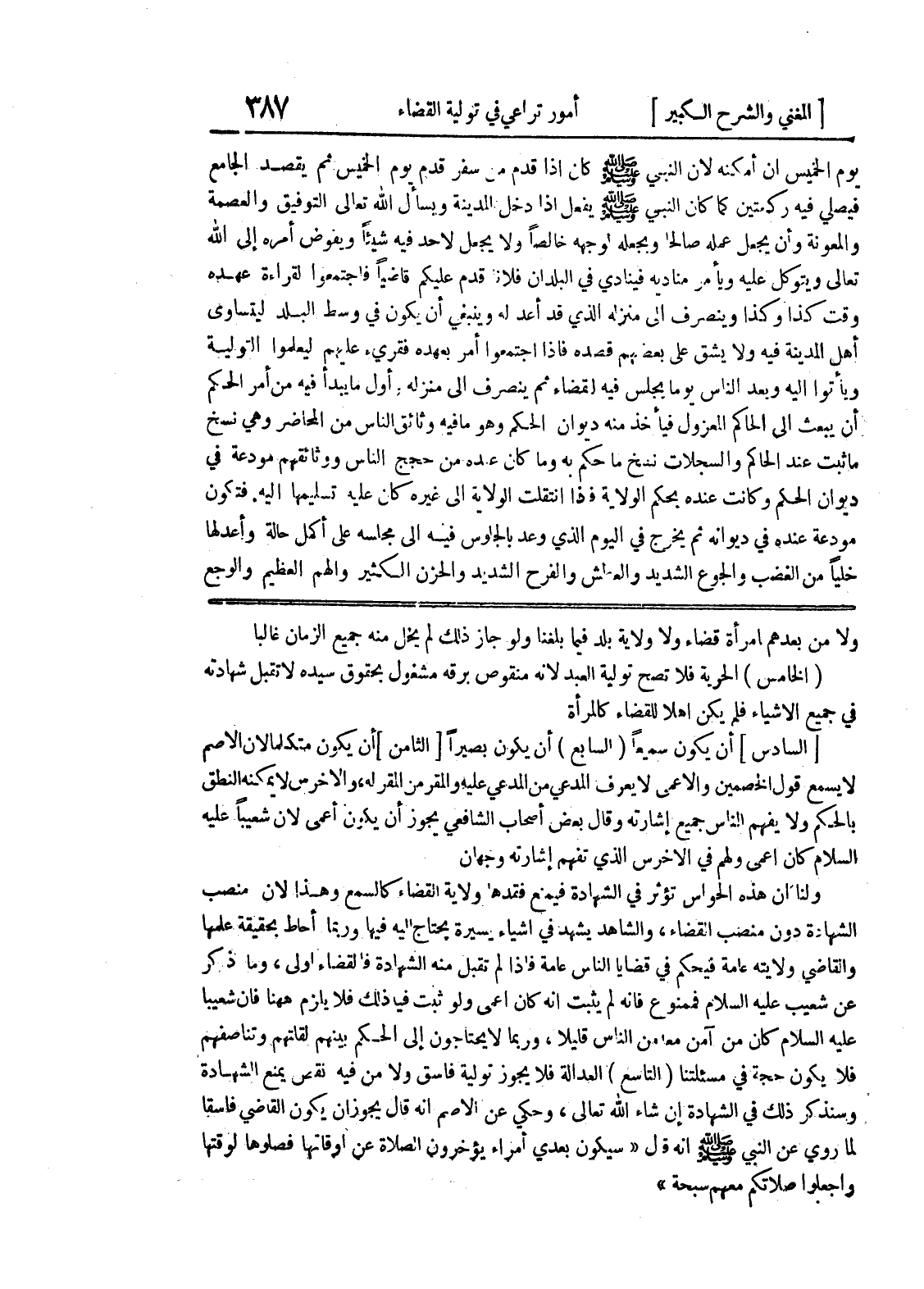 [السادس] أن يكون سميعاً (السابع) أن يكون بصيراً [الثامن] أن يكون متكلماً لأن الأصم لا يسمع قول الخصمين والأعمى لا يعرف المدعي من المدعي عليه والمقر من المقر له، والأخرس لا يمكنه النطق بالحكم ولا يفهم الناس جميع إشارته وقال بعض أصحاب الشافعي يجوز أن يكون أعمى لأن شعيباً عليه السلام كان أعمى ولهم في الأخرس الذي تفهم إشارته وجهان ولنا أن هذه الحواس تؤثر في الشهادة فيمنع فقدها ولاية القضاء كالسمع وهذا لأن منصب الشهادة دون منصب القضاء، والشاهد يشهد في أشياء يسيرة يحتاج إليه فيها وربما أحاط بحقيقة علمها والقاضي ولايته عامة فيحكم في قضايا الناس عامة فإذا لم تقبل منه الشهادة فالقضاء أولى، وما ذكر عن شعيب عليه السلام فممنوع فإنه لم يثبت أنه كان أعمى ولو ثبت فيه ذلك فلا يلزم ههنا فإن شعيباً عليه السلام كان من آمن معه من الناس قليلاً، وربما لا يحتاجون إلى الحكم بينهم لقلتهم وتناصفهم فلا يكون حجة في مسئلتنا (التاسع) العدالة فلا يجوز تولية فاسق ولا من فيه نقص يمنع الشهادة وسنذكر ذلك في الشهادة إن شاء الله تعالى، وحكي عن الأصم أنه قال يجوز أن يكون القاضي فاسقاً لما روي عن النبي صلى الله عليه وسلم أنه قال " سيكون بعدي أمراء يؤخرون الصلاة عن أوقاتها فصلوها لوقتها واجعلوا صلاتكم معهم سبحة "