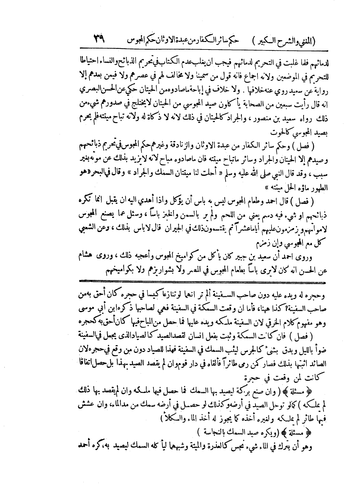 وهو مفهوم كلام الخرقي لأن السفينة ملكه ويده عليها فما حصل من المباح فيها كان أحق به كحجره (فصل) فإن كانت السمكة وثبت بفعل إنسان لقصد الصيد كالصياد الذي يجعل في السفينة ضوأ بالليل وبدق بشئ كالجرس ليثب السمك في السفينة فهذا للصياد دون من وقع في حجره لأن الصائد أثبتها بذلك فصار كمن رمى طائراً فألقاه في دار قوم وإن لم يقصد الصيد بهذا بل حصل اتفاقاً كانت لمن وقعت في حجره * (مسألة) * (وإن صنع بركة ليصيد بها السمك فما حصل فيها ملكه وإن لم يقصد بها ذلك لم يملكه) كما لو توحل الصيد في ارضه وكذلك لو حصل في أرضه سمك من مد الماء، وإن عشش فيها طائر لم يملكه ولغيره أخذه كما يجوز له أخذ الماء والكلأ) * (مسألة) * (ويكره صيد السمك بالنجاسة) وهو أن يترك في الماء شئ نجس كالعذرة والميتة وشبههما ليأكله السمك ليصيد به، كره أحمد