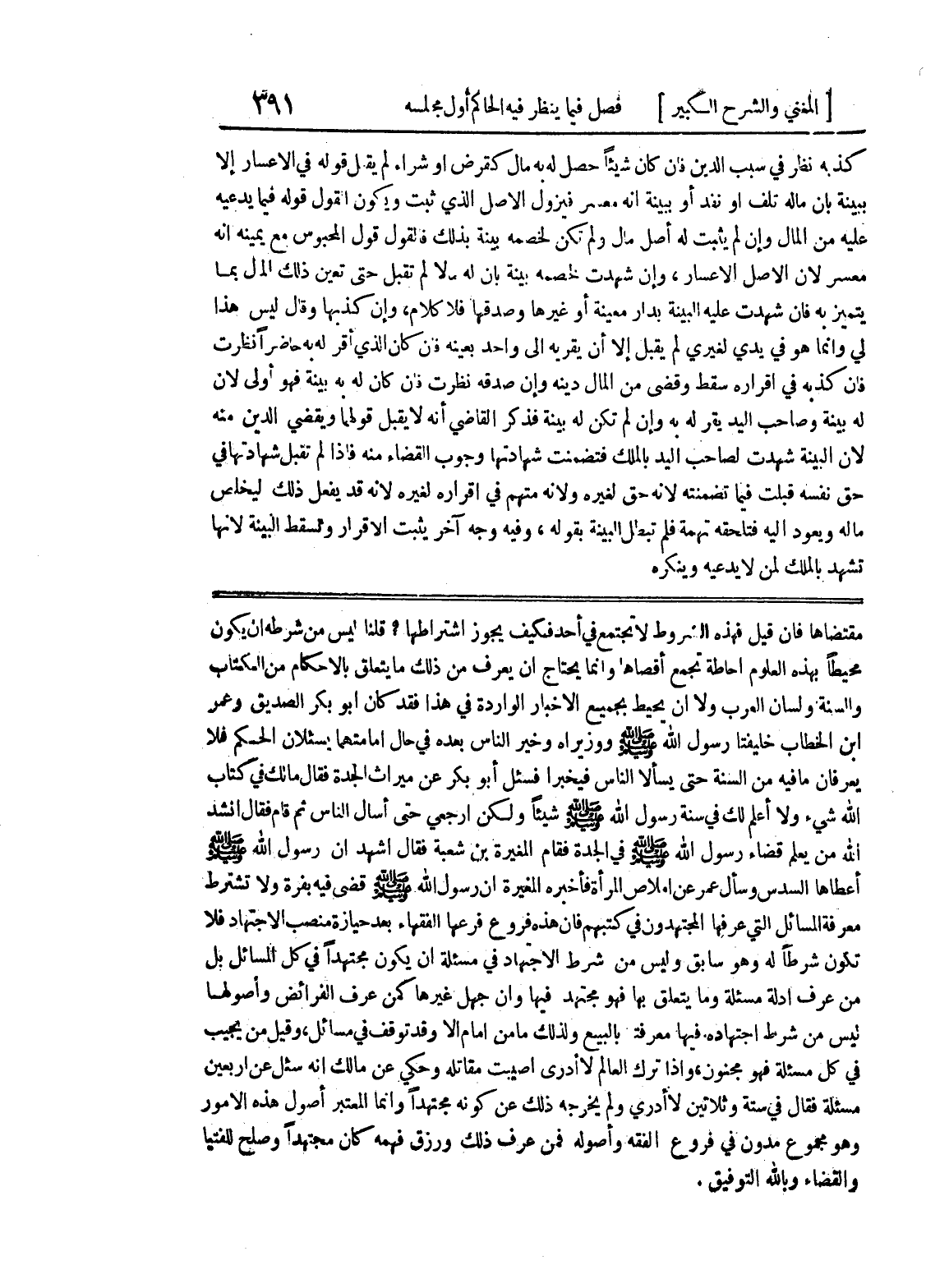 مقتضاها فإن قيل فهذه الشروط لا تجتمع في أحد فكيف يجوز اشتراطها؟ قلنا ليس من شرطه أن يكون محيطاً بهذه المعلوم إحاطة تجمع أقصاها وإنما يحتاج أن يعرف من ذلك ما يتعلق بالأحكام من الكتاب والسنة ولسان العرب ولا أن يحيط بجميع الأخبار الواردة في هذا فقد كان أبو بكر الصديق وعمر ابن الخطاب خليفتا رسول الله صلى الله عليه وسلم ووزيراه وخير الناس بعده في حال امامتهما يسئلان الحكم فلا يعرفان ما فيه من السنة حتى يسألا الناس فيخبرا فسئل أبو بكر عن ميراث الجدة فقال مالك في كتاب