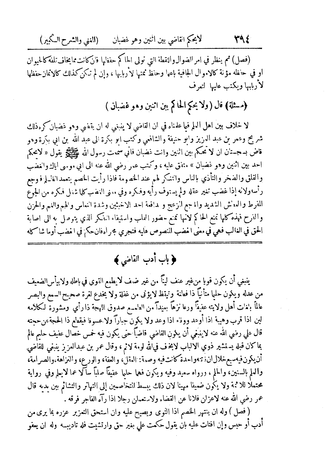 * (باب أدب القاضي) * ينبغي أن يكون قوياً من غير عنف لينا من غير ضعف لا يطمع القوي في باطله ولا ييأس الضعيف من عدله ويكون حليماً متأنياً ذا فطنة وتيقظ لا يؤتى من غفلة ولا يخدع لغرة صحيح السمع والبصر عالماً بلغات أهل ولايته عفيفاً ورعاً نزهاً بعيداً من الطمع صدوق اللهجة ذا رأي ومشورة لكلامه