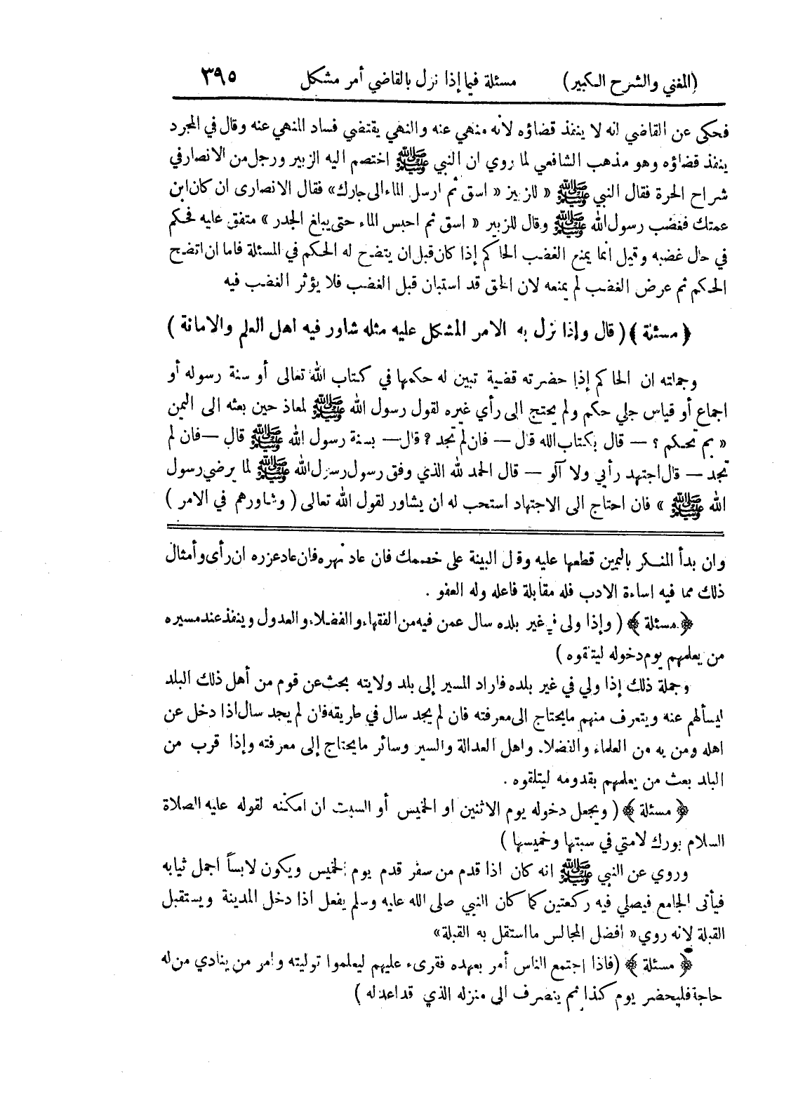 * (مسألة) * (وإذا ولي في غير بلده سأل عمن فيه من الفقهاء والفضلاء والعدول وينفذ عند مسيره من يعلمهم يوم دخوله ليتقوه) وجملة ذلك إذا ولي في غير بلده فأراد المسير إلى بلد ولايته بحث عن قوم من أهل ذلك البلد ليسألهم عنه ويتعرف منهم ما يحتاج إلى معرفته فإن لم يجد سال في طريقه فإن لم يجد سال إذا دخل عن أهله ومن به من العلماء والفضلاء وأهل العدالة والسير وسائر ما يحتاج إلى معرفته وإذا قرب من البلد بعث من يعلمهم بقدومه ليتلقوه.