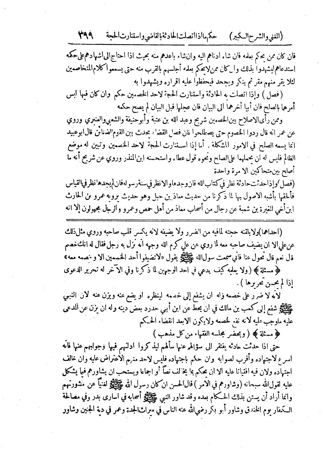 لأنه لا ضرر على خصمه وله أن يشفع إلى خصمه لينظره أو يضع عنه ويزن عنه لأن النبي صلى الله عليه وسلم شفع إلى كعب بن مالك في أن يحط عن ابن أبي حدرد بعض دينه وله أن يزن عن المدعي عليه ما وجب عليه لأنه نفع لخصمه ولا يكون إلا بعد انقضاء الحكم * (مسألة) * (ويحضر مجلسه الفقهاء من كل مذهب) حتى إذا حدثت حادثة يفتقر إلى سؤالهم عنها سألهم ليذكروا ادلتهم فيها وجوابهم عنها فإنه اسرع لاجتهاده وأقرب لصوابه وأن حكم بإجتهاده فليس لأحد منهم الإعتراض عليه وإن خالف اجتهاده ولان فيه افتياتا عليه إلا أن يحكم بما يخالف نصا أو اجماعا ويستحب ان يشاورهم فيما يشكل عليه لقول الله سبحانه (وشاورهم في الأمر) قال الحسن أن كان رسول الله صلى الله عليه وسلم لغنياً عن مشورتهم