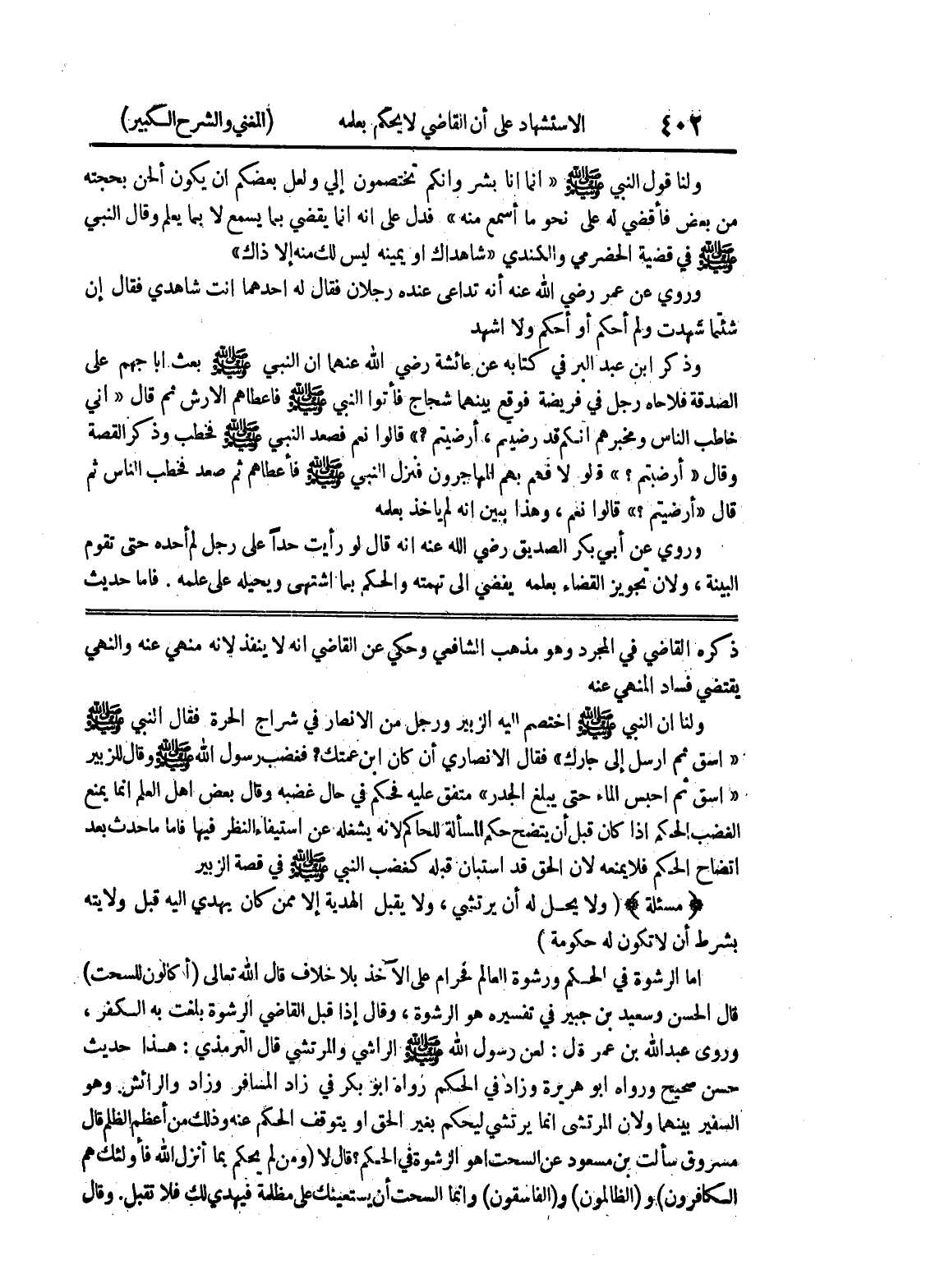 ذكره القاضي في المجرد وهو مذهب الشافعي وحكي عن القاضي أنه لا ينفذ لأنه منهي عنه والنهي يقتضي فساد المنهي عنه ولنا أن النبي صلى الله عليه وسلم اختصم إليه الزبير ورجل من الأنصار في شراج الحرة فقال النبي صلى الله عليه وسلم " اسق ثم ارسل إلى جارك " فقال الأنصاري إن كان ابن عمتك؟ فغضب رسول الله صلى الله عليه وسلم وقال للزبير " اسق ثم احبس الماء حتى يبلغ الجدر " متفق عليه فحكم في حال غضبه وقال بعض أهل العلم إنما يمنع الغضب الحكم إذا كان قبل أن يتضح حكم المسألة للحاكم لأنه يشغله عن استيفاء النظر فيها فأما ما حدث بعد اتضاح الحكم فلا يمنعه لأن الحق قد استبان قبله كغضب النبي صلى الله عليه وسلم في قصة الزبير * (مسألة) * (ولا يحل له أن يرتشي، ولا يقبل الهدية إلا ممن كان يهدي إليه قبل ولايته