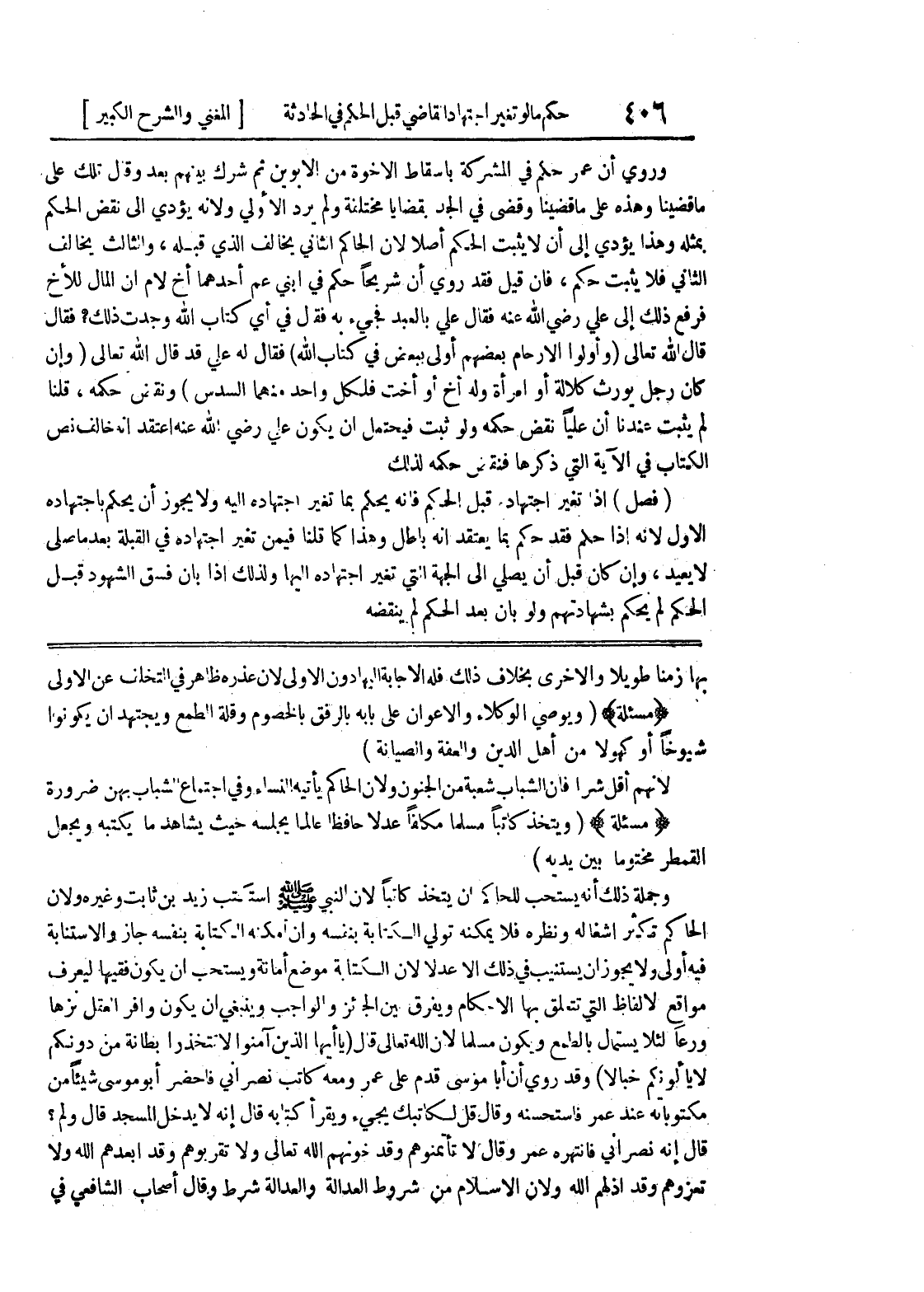 بها زمنا طويلا والأخرى بخلاف ذلك فله الإجابة إليها دون الأولى لأن عذره ظاهر في التخلف عن الأولى * (مسألة) * (ويوصي الوكلاء والأعوان على بابه بالرفق بالخصوم وقلة الطمع ويجتهد أن يكونوا شيوخاً أو كهولاً من أهل الدين والعفة والصيانة) لأنهم أقل شرا فإن الشباب شعبة من الجنون ولأن الحاكم يأتيه النساء وفي اجتماع الشباب بهن ضرورة * (مسألة) * (ويتخذ كاتباً مسلماً مكلفاً عدلاً حافظاً عالماً يجلسه حيث يشاهد ما يكتبه ويجعل القمطر مختوماً بين يديه) وجملة ذلك أنه يستحب للحاكم أن يتخذ كاتباً لأن النبي صلى الله عليه وسلم استكتب زيد بن ثابت وغيره ولأن الحاكم تكثر اشغاله ونظره فلا يمكنه تولي الكتابة بنفسه وإن أمكنه الكتابة بنفسه جاز والاستنابة فيه أولى ولا يجوز أن يستنيب في ذلك إلا عدلاً لأن الكتابة موضع أمانة ويستحب أن يكون فقيهاً ليعرف مواقع الألفاظ التي تتعلق بها الأحكام ويفرق بين الجائز والواجب وينبغي أن يكون وافر العقل نزها ورعا لئلا يستمال بالطمع ويكون مسلماً لأن الله تعالى قال (يا أيها الذين آمنوا لا تتخذوا بطانة من دونكم