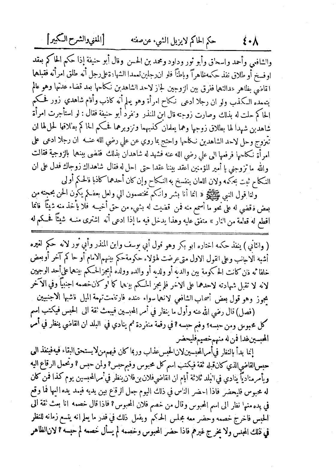 أشبه الأجانب وعلى القول الأول متى عرضت لهؤلاء حكومة حكم بينهم الإمام أو حاكم آخر أو بعض خلفائه فإن كانت الحكومة بين والديه أو ولديه أو والده وولده لم يجز الحكم بينهما على أحد الوجهين لأنه لا تقبل شهادته لأحدهما على الآخر فلم يجز الحكم بينهما كما لو كان خصمه أجنبياً وفي الآخر يجوز وهو قول بعض أصحاب الشافعي لأنهما سواء عنده فارتفعت تهمة الميل فأشبها الأجنبيين (فصل) قال رضي الله عنه وأول ما ينظر في أمر المحبسين فيبعث ثقة إلى الحبس فيكتب اسم كل محبوس ومن حبسه؟ وفيم حبسه؟ في رقعة منفردة ثم ينادي في البلدان القاضي ينظر في أمر المحبسين غداً فمن له منهم خصيم فليحضر إنما بدأ بالنظر في امر المحبسين لأن الحبس عذاب وربما كان فيهم من لا يستحق البقاء فيه فينفذ إلى حبس القاضي الذي كان قبله ثقة فيكتب اسم كل محبوس وفيم حبس؟ ولمن حبس؟ وتحمل الرقاع إليه ويأمر منادياً ينادي في البلد ثلاثة أيام أن القاضي فلان بن فلان ينظر في أمر المحبسين يوم كذا فمن كان له محبوس فليحضر فإذا احضر الناس في ذلك اليوم جعل الرقاع بين يديه فيمد يده إليها فما وقع في يده منها نظر إلى اسم المحبوس وقال من خصم فلان المحبوس؟ فإذا قال خصمه أنا بعث ثقة إلى الحبس فاخرج خصمه وحضر معه مجلس الحكم ويفعل ذلك في قدر ما يعلم أنه يتسع زمانه للنظر في ذلك المجلس ولا يخرج غيرهم فإذا حضر المحبوس وخصمه لم يسأل خصمه لم حبسه؟ لأن الظاهر