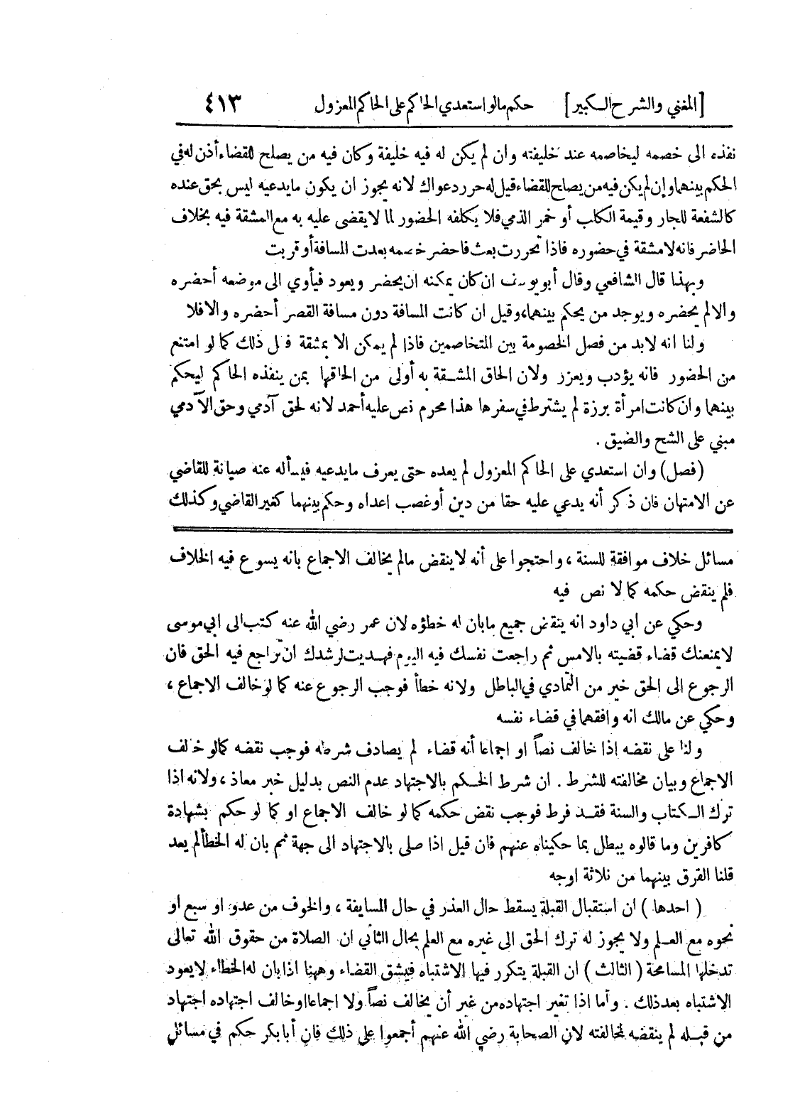 مسائل خلاف موافقة للسنة، واحتجوا على أنه لا ينقض ما لم يخالف الإجماع بأنه يسوع فيه الخلاف فلم ينقض حكمه كما لا نص فيه وحكي عن أبي داود انه ينقض جميع ما بان له خطؤه لأن عمر رضي الله عنه كتب إلى أبي موسى لا يمنعك قضاء قضيته بالأمس ثم راجعت نفسك فيه اليوم فهديت لرشدك أن تراجع فيه الحق فإن الرجوع إلى الحق خير من التمادي في الباطل ولأنه خطأ فوجب الرجوع عنه كما لو خالف الإجماع، وحكي عن مالك أنه وافقهما في قضاء نفسه ولنا على نقضه إذا خالف نصاً أو إجماعاً أنه قضاء لم يصادف شرطه فوجب نقضه كما لو خالف الإجماع وبيان مخالفته للشرط.