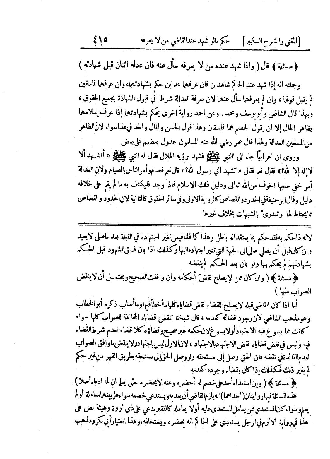 لأنه إذا حكم به فقد حكم بما يعتقد أنه باطل وهذا كما قلنا فيمن تغير اجتهاده في القبلة بعدما صلى لا يعيد وإن كان قبل أن يصلي صلى إلى الجهة التي تغير اجتهاده إليها وكذلك إذا بان فسق الشهود قبل الحكم بشهادتهم لم يحكم بها ولو بان بعد الحكم لم ينقضه * (مسألة) * (وإن كان ممن لا يصلح نقض أحكامه وإن وافقت الصحيح ويحتمل أن لا ينقض الصواب منها) أما إذا كان القاضي قبله لا يصلح للقضاء نقض قضاياه كلها ما أخطأ فيها وما أصاب ذكره أبو الخطاب وهو مذهب الشافعي لأن وجود قضائه كعدمه، قال شيخنا تنقض قضاياه المخالفة للصواب كلها سواء كانت مما يسوغ فيه الاجتهاد أو لا يسوغ لأن حكمه غير صحيح وقضاؤه كلا قضاء لعدم شرط القضاء فيه وليس في نقض قضاياه نقض الاجتهاد بالاجتهاد، لأن الأول ليس باجتهاد ولا ينقض ما وافق الصواب لعدم الفائدة في نقضه فإن الحق وصل إلى مستحقه ولو وصل الحق إلى مستحقه بطريق القهر من غير حكم لم يغير ذلك فكذلك إذا كان بقضاء وجوده كعدمه * (مسألة) * (وإن استعداه أحد على خصم له أحضره وعنه لا يحضره حتى يعلم أن لما ادعاه أصلا) هذه المسألة فيها روايتان (إحداهما) أنه يلزم القاضي أن يعديه ويستدعي خصمه سواء عما بينهما معاملة أو لم يعلم وسواء كان المستعدي ممن يعامل المستعدى عليه أو لا يعامله كالفقير يدعي على ذي ثروة وهيئة نص على هذا في رواية الأثرم في الرجل يستعدي على الحاكم أنه يحضره ويستحلفه، وهذا اختيار أبي بكر ومذهب