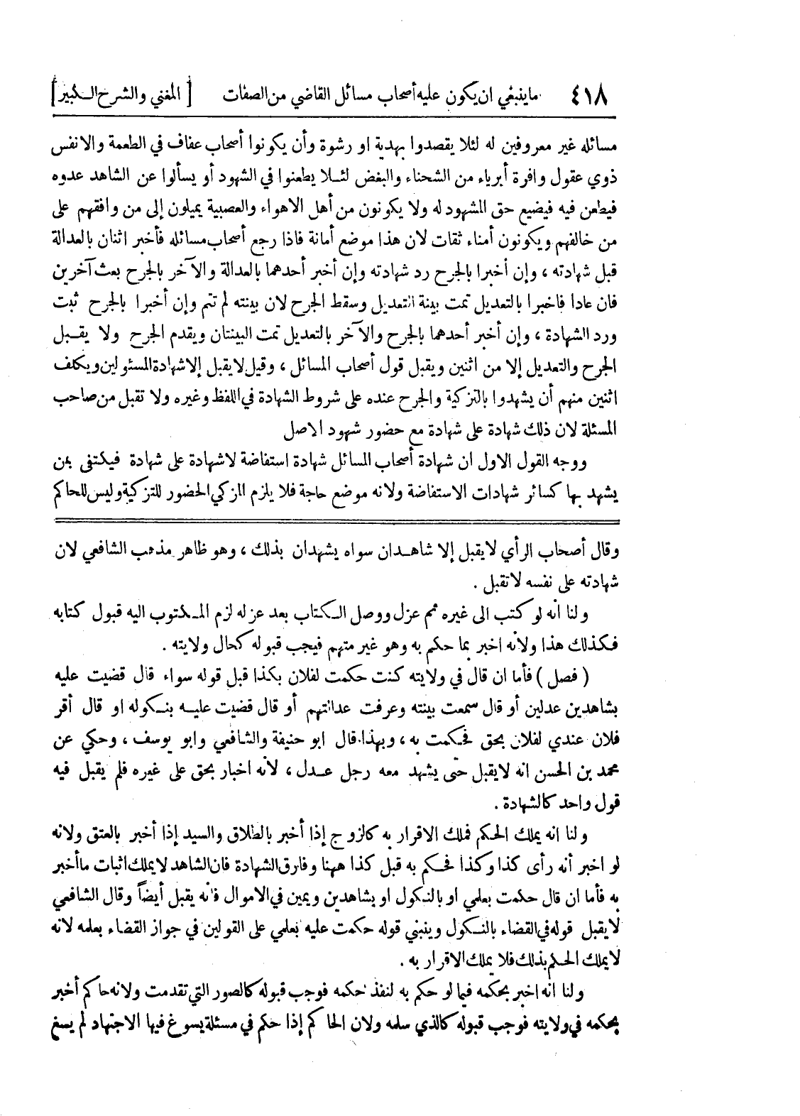 ولنا أنه يملك الحكم فملك الإقرار به كالزوج إذا أخبر بالطلاق والسيد إذا أخبر بالعتق ولأنه لو أخبر أنه رأى كذا وكذا فحكم به قبل كذا ههنا وفارق الشهادة فإن الشاهد لا يملك إثبات ما أخبر به فأما إن قال حكمت بعلمي أو بالنكول أو بشاهدين ويمين في الأموال فإنه يقبل أيضاً وقال الشافعي لا يقبل قوله في القضاء بالنكول وينبني قوله حكمت عليه بعلمي على القولين في جواز القضاء بعلمه لأنه لا يملك الحكم بذلك فلا يملك الإقرار به.