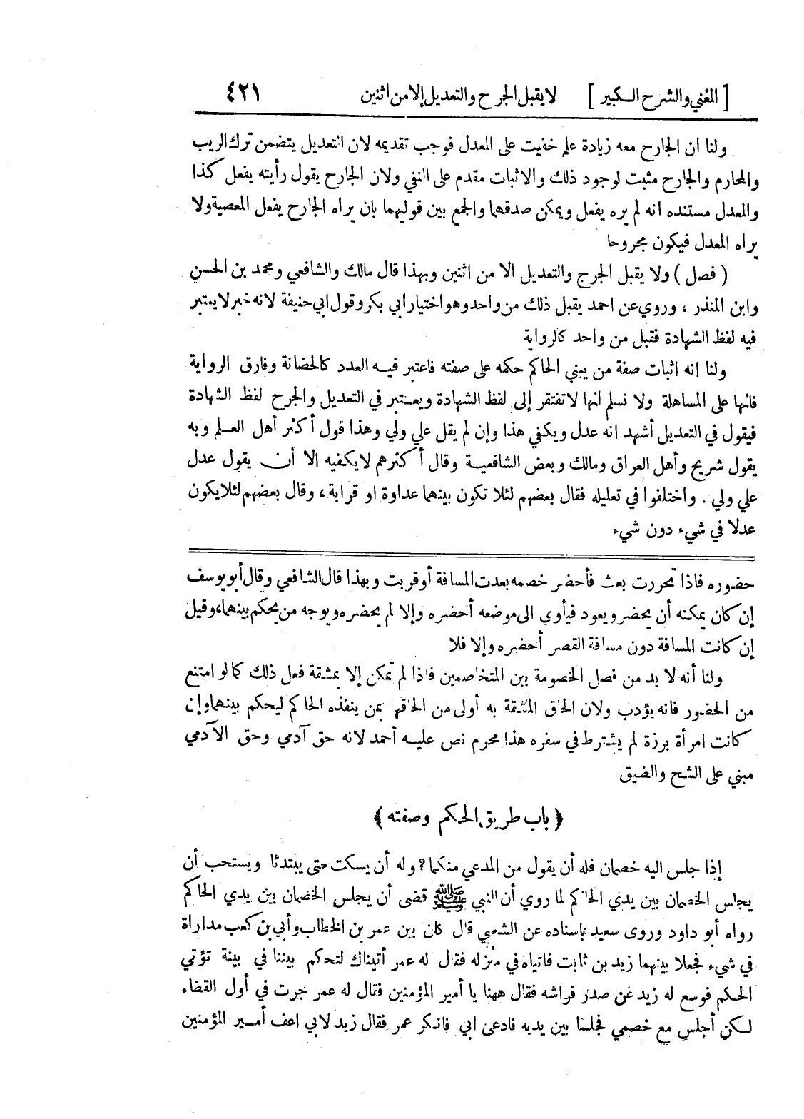 حضوره فإذا تحررت بعث فأحضر خصمه بعدت المسافة أو قربت وبهذا قال الشافعي وقال أبو يوسف إن كان يمكنه أن يحضر ويعود فيأوي إلى موضعه أحضره وإلا لم يحضره ويوجه من يحكم بينهما، وقيل إن كانت المسافة دون مسافة القصر أحضره وإلا فلا ولنا أنه لابد من فصل الخصومة بين المتخاصمين فإذا لم تمكن إلا بمشقة فعل ذلك كما لو امتنع من الحضور فإنه يؤدب ولأن الحاق المشقة به أولى من إلحاقها بمن ينفذه الحاكم ليحكم بينهما وإن كانت امراة برزة لم يشترط في سفره هذا محرم نص عليه أحمد لأنه حق آدمي وحق الآدمي مبني على الشح والضيق (باب طريق الحكم وصفته) إذا جلس إليه خصمان فله أن يقول من المدعي منكما؟ وله أن يسكت حتى يبتدئا ويستحب أن يجلس الخصمان بين يدي الحاكم لما روي أن النبي صلى الله عليه وسلم قضى أن يجلس الخصمان بين يدي الحاكم رواه أبو داود وروى سعيد بإسناده عن الشعبي قال كان بين عمر بن الخطاب وأبي بن كعب مداراة