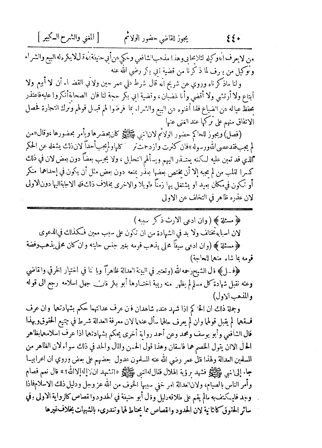 وأمر الناس بالصيام، ولأن العدالة أمر خفي سببها الخوف من الله عزوجل ودليل ذلك الإسلام فإذا وجد فليكتف به ما لم يقم على طلاقه دليل وقال أبو حنيفة في الحدود والقصاص كالرواية الأولى وفي سائر الحقوق كالثانية لأن الحدود والقصاص مما يحتاط لهما وتندرئ بالشبهات بخلاف غيرها
