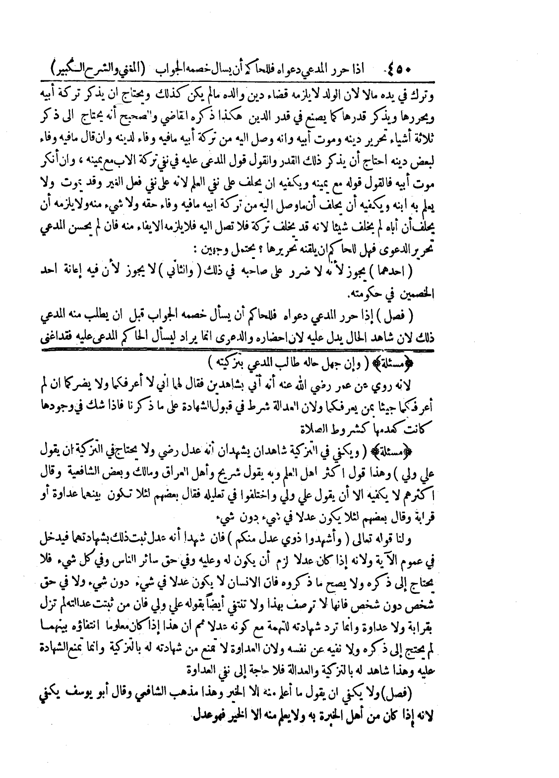 * (مسألة) * (وإن جهل حاله طالب المدعي بتزكيته) لأنه روي عن عمر رضي الله عنه انه أتي بشاهدين فقال لهما إني لا أعرفكما ولا يضركما إن لم أعرفكما جيئا بمن يعرفكما ولأن العدالة شرط في قبول الشهادة على ما ذكرنا فإذا شك في وجودها كانت كعدمها كشروط الصلاة * (مسألة) * (ويكفي في التزكية شاهدان يشهدان أنه عدل رضي ولا يحتاج في التزكية أن يقول علي ولي) وهذا قول أكثر أهل العلم وبه يقول شريح وأهل العراق ومالك وبعض الشافعية وقال أكثرهم لا يكفيه إلا أن يقول علي ولي واختلفوا في تعليله فقال بعضهم لئلا تكون بينهم عداوة أو قرابة وقال بعضهم لئلا يكون عدلا في شئ دون شئ ولنا قوله تعالى (وأشهدوا ذوي عدل منكم) فإن شهدا أنه عدل ثبت ذلك بشهادتهما فيدخل في عموم الآية ولأنه إذا كان عدلا لزم أن يكون له وعليه وفي حق سائر الناس وفي كل شئ فلا يحتاج إلى ذكره ولا يصح ما ذكروه فإن الإنسان لا يكون عدلا في شئ دون شي؟ ء ولا في حق شخص دون شخص فإنها لا توصف بهذا ولا تنتفي ايضاً بقوله علي ولي فإن من ثبتت عدالته لم تزل بقرابة ولا عداوة وإنما ترد شهادته للتهمة مع كونه عدلا ثم أن هذا إذا كان معلوماً انتفاؤه بينهما لم يحتج إلى ذكره ولا نفيه عن نفسه ولأن العداوة لا تمنع من شهادته له بالتزكية وإنما تمنع الشهادة عليه وهذا شاهد له بالتزكية والعدالة فلا حاجة إلى نفي العداوة (فصل) ولا يكفي أن يقول ما أعلم منه إلا الخير وهذا مذهب الشافعي وقال أبو يوسف يكفي لأنه إذا كان من أهل الخبرة به ولا يعلم منه إلا الخير فهو عدل