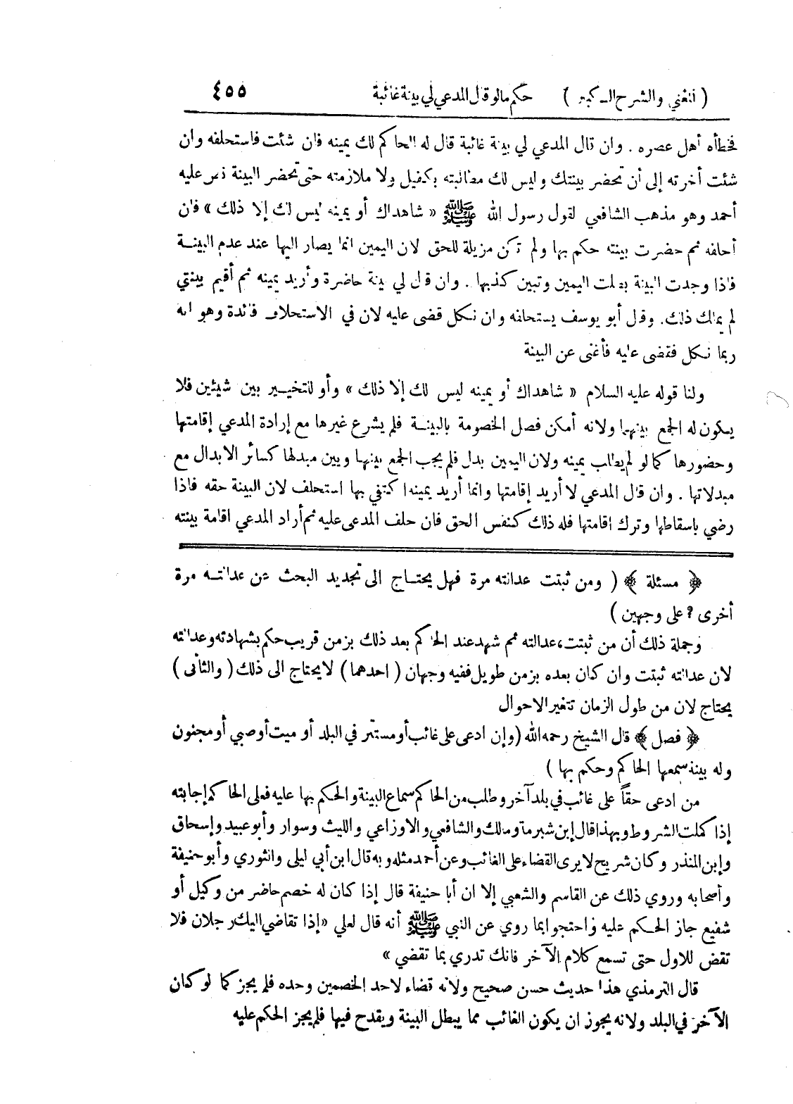 * (مسألة) * (ومن ثبتت عدالته مرة فهل يحتاج إلى تجديد البحث عن عدالته مرة أخرى؟ على وجهين) وجملة ذلك أن من ثبتت، عدالته ثم شهد عند الحاكم بعد ذلك بزمن قريب حكم بشهادتة وعدالته لأن عدالته ثبتت وإن كان بعده بزمن طويل ففيه وجهان (أحدهما) لا يحتاج إلى ذلك (والثاني) يحتاج لأن من طول الزمان تتغير الأحوال * (فصل) * قال الشيخ رحمه الله (وإن ادعى على غائب أو مستتر في البلد أو ميت أو صبي أو مجنون وله بينة سمعها الحاكم وحكم بها) من ادعى حقاً على غائب في بلد آخر وطلب من الحاكم سماع البينة والحكم بها عليه فعلى الحاكم إجابته إذا كملت الشروط وبهذا قال ابن شبرمة ومالك والشافعي والاوزاعي والليث وسوار وأبو عبيد وإسحاق وابن المنذر وكان شريح لا يرى القضاء على الغائب وعن أحمد مثله وبه قال ابن أبي ليلى والثوري وأبو حنيفة وأصحابه وروي ذلك عن القاسم والشعبي إلا أن أبا حنيفة قال إذا كان له خصم حاضر من وكيل أو شفيع جاز الحكم عليه واحتجوا بما روي عن النبي صلى الله عليه وسلم أنه قال لعل " إذا تقاضى إليك رجلان فلا تقض للأول حتى تسمع كلام الآخر فإنك تدري بما تقضي " قال الترمذي هذا حديث حسن صحيح ولأنه قضاء لأحد الخصمين وحده فلم يجز كما لو كان الآخر في البلد ولأنه يجوز أن يكون الغائب مما يبطل البينة ويقدح فيها فلم يجز الحكم عليه