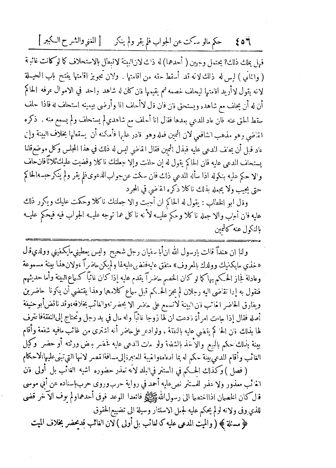 ولنا أن هنداً قالت يا رسول الله إن أبا سفيان رجل شحيح وليس يعطيني ما يكفيني وولدي قال " خذي ما يكفيك وولدك بالمعروف " متفق عليه ففضى عليه لها ولم يكن حاضراً، ولأن هذا بينة مسموعة وعادلة فجاز الحكم بها كما لو كان الخصم حاضراً يقدم عليه إذا كان غائباً كسماع البينة وأما حديثهم فنقول به إذا تقاضى إليه رجلان لم يجز الحكم قبل سماع كلامهما وهذا يقتضي أن يكونا حاضرين ويفارق الحاضر الغائب فإن البينة لا تسمع على حاضر إلا بحضرته والغائب بخلافه، وقد ناقض أبو حنيفة