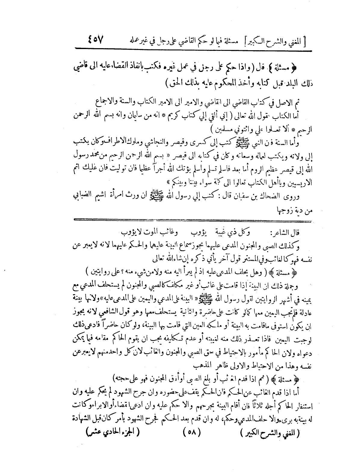 قال الشاعر: وكل ذي غيبة يؤوب * وغائب الموت لا يؤوب وكذلك الصبي والمجنون المدعى عليهما يجوز سماع البينة عليهما والحكم عليهما لأنه لا يعبر عن نفسه فهو كالغائب وفي المستتر قول آخر يأتي ذكره إن شاء الله تعالى.