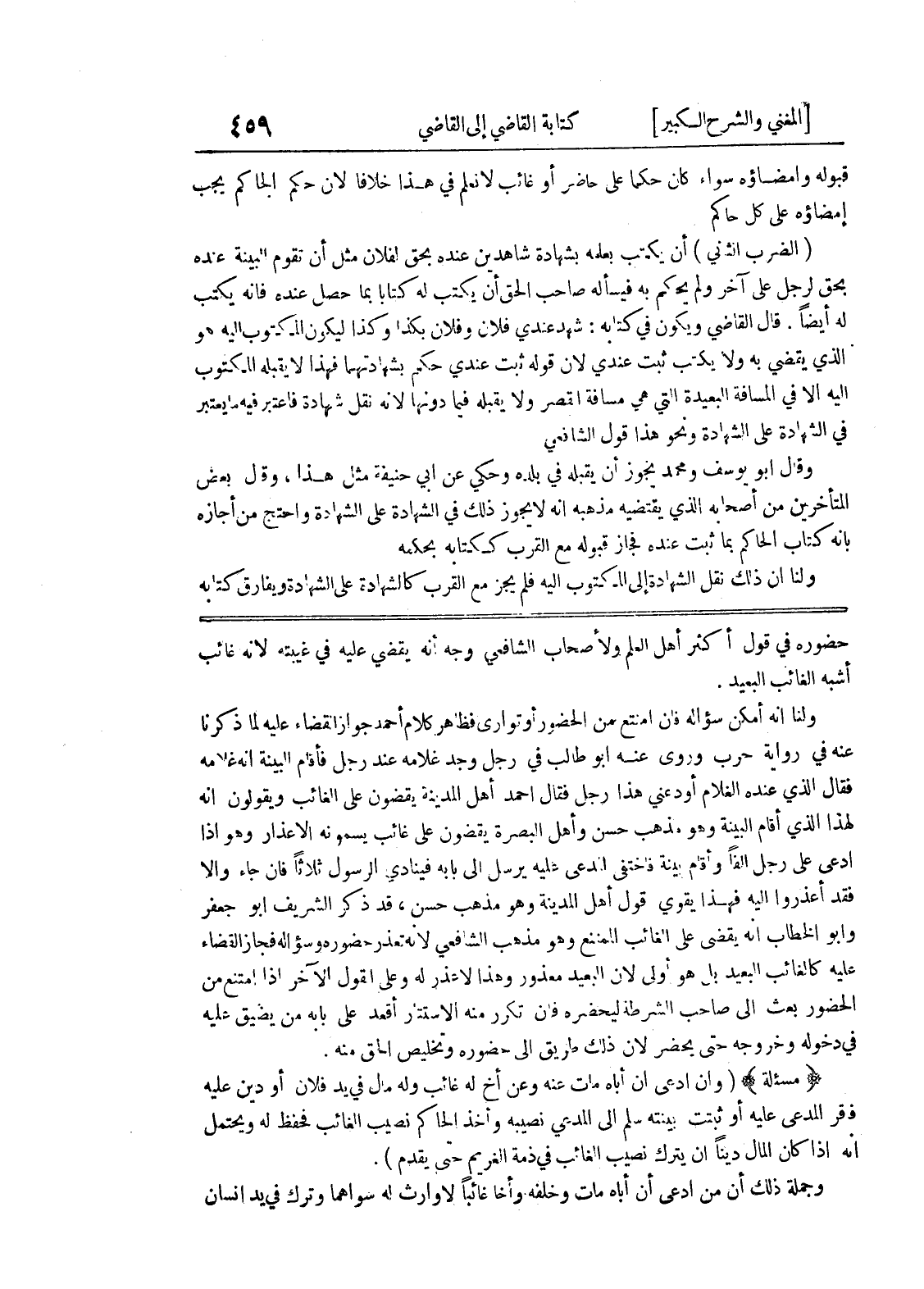 حضوره في قول أكثر أهل العلم ولأصحاب الشافعي وجه أنه يقضي عليه في غيبته لأنه غائب أشبه الغائب البعيد.