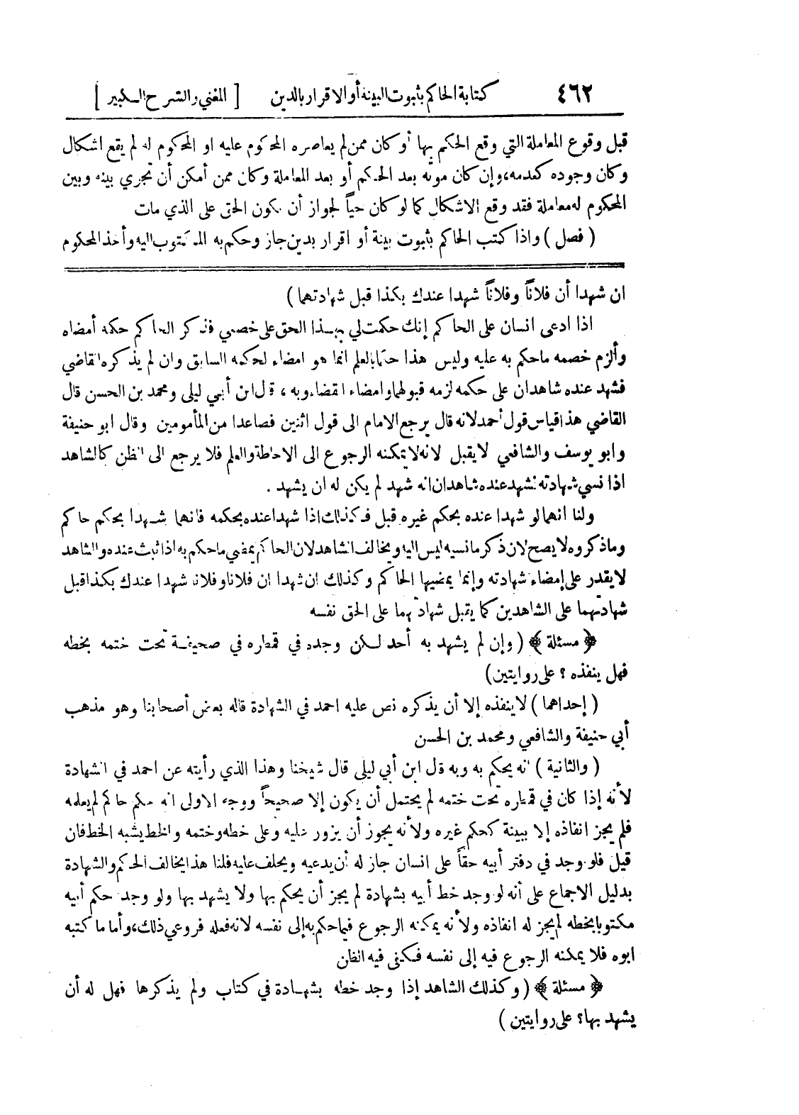 ولنا أنهما لو شهدا عنده بحكم غيره قبل فكذلك إذا شهدا عنده بحكمه فإنهما شهدا بحكم حاكم وما ذكروه لا يصح لأن ذكر ما نسيه اليه ويخالف الشاهد لأن الحاكم يمضي ما حكم به إذا ثبت عنده والشاهد لا يقدر على إمضاء شهادته وإنما يمضيها الحاكم وكذلك إن شهدا أن فلاناً وفلاناً شهدا عندك بكذا قبل شهادتهما على الشاهدين كما يقبل شهادتهما على الحق نفسه * (مسألة) * (وإن لم يشهد به أحد لكن وجده في قمطره في صحيفة تحت ختمه بخطه فهل ينفذه؟ على روايتين) (إحداهما) لا ينفذه إلا أن يذكره نص عليه أحمد في الشهادة قاله بعض أصحابنا وهو مذهب أبي حنيفة والشافعي ومحمد بن الحسن (والثانية) أنه يحكم به وبه قال ابن ابي ليلى قال شيخنا وهذا الذي رأيته عن أحمد في الشهادة لأنه إذا كان في قمطره تحت ختمه لم يحتمل أن يكون إلا صحيحاً ووجه الأولى أنه حكم حاكم لم يعلمه فلم يجز انفاذه إلا ببينة كحكم غيره ولأنه يجوز أن يزور عليه وعلى خطه وختمه والخط يشبه الخط فإن قيل فلو وجد في دفتر أبيه حقاً على إنسان جاز له أن يدعيه ويحلف عليه فلنا هذا يخالف الحكم والشهادة بدليل الإجماع على أنه لو وجد خط أبيه بشهادة لم يجز أن يحكم بها ولا يشهد بها ولو وجد حكم أبيه مكتوباً بخطه لم يجز له انفاذه ولأنه يمكنه الرجوع فيما حكم به إلى نفسه لأنه فعله فروعي ذلك، وأما ما كتبه أبوه فلا يمكنه الرجوع فيه إلى نفسه فكفى فيه الظن