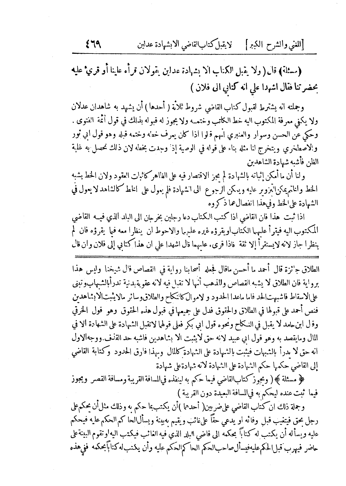 الطلاق جائزة قال أحمد ما أحسن ما قال فجعله أصحابنا رواية في القصاص قال شيخنا وليس هذا برواية فإن الطلاق لا يشبه القصاص والمذهب أنها لا تقبل فيه لأنه عقوبة بدنية تدرأ بالشبهاب وتبنى على الإسقاط فأشبهت الحد فأما ما عدا الحدود ولاموال كالنكاح والطلاق وسائر ما لا يثبت إلا بشاهدين فنص أحمد على قبولها في الطلاق والحقوق فدل على جميعها في قبول هذا الحقوق وهو قول الخرقي وقال ابن حامد لا يقبل في النكاح ونحوه قول أبي بكر فعلى قولهما لا تقبل الشهادة على الشهادة إلا في المال وما يقصد به وهو قول أبي عبيد لأنه حق لا يثبت إلا بشاهدين فأشبه حد القذف ووجه الأول أنه حق لا يدرأ بالشبهات فيثبت بالشهادة على الشهادة كالمال وبهذا فارق الحدود وكتابة القاضي إلى القاضي حكمها حكم الشهادة على الشهادة لأنه شهادة على شهادة * (مسألة) * (ويجوز كتاب القاضي فيما حكم به لينفذه في المسافة القريبة ومسافة القصر ويجوز فيما ثبت عنده ليحكم به في المسافة البعيدة دون القريبة) وجملة ذلك أن كتاب القاضي على ضربين (أحدهما) أن يكتب بما حكم به وذلك مثل أن يحكم على رجل بحق فيتغيب قبل وفائه أو يدعي حقاً على غائب ويقيم به بينة ويسأل الحاكم الحكم عليه فيحكم عليه ويسأله أن يكتب له كتاباً بحكمه إلى قاضي البلد الذي فيه الغائب فيكتب اليه أو تقوم البينة على حاضر فيهرب قبل الحكم عليه فيسأل صاحب الحكم الحاكم الحكم عليه وأن يكتب له كتاباً بحكمه ففي هذه