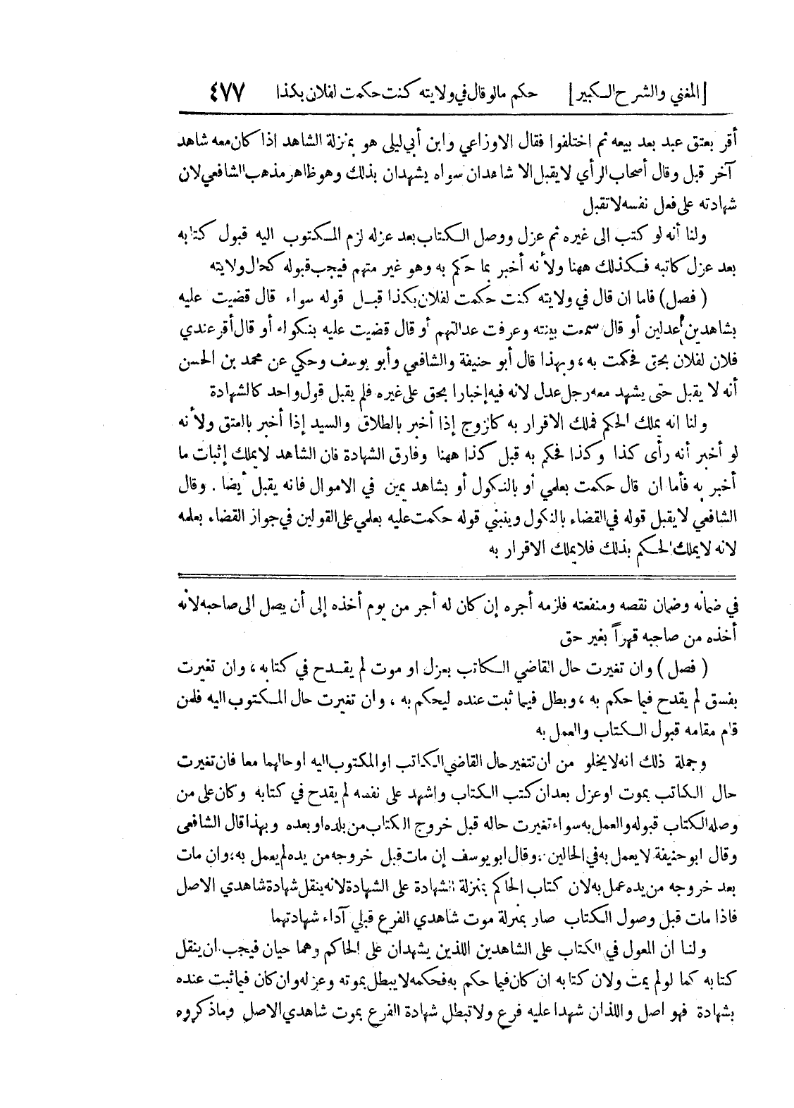 في ضمانه وضمان نقصه ومنفعته فلزمه أجره إن كان له أجر من يوم أخذه إلى أن يصل الى صاحبه لأنه أخذه من صاحبه قهراً بغير حق (فصل) وإن تغيرت حال القاضي الكاتب بعزل أو موت لم يقدح في كتابه، وإن تغيرت بفسق لم يقدح فيما حكم به، وبطل فيما ثبت عنده ليحكم به، وإن تغيرت حال المكتوب إليه فلمن قام مقامه قبول الكتاب والعمل به وجملة ذلك أنه لا يخلو من أن تتغير حال القاضي الكاتب أو المكتوب اليه أو حالهما معاً فإن تغيرت حال الكاتب بموت أو عزل بعد أن كتب الكتاب وأشهد على نفسه لم يقدح في كتابه وكان على من وصله الكتاب قبوله والعمل به سواء تغيرت حاله قبل خروج الكتاب من بلده أو بعده وبهذا قال الشافعي وقال أبو حنيفة لا يعمل به في الحالين.