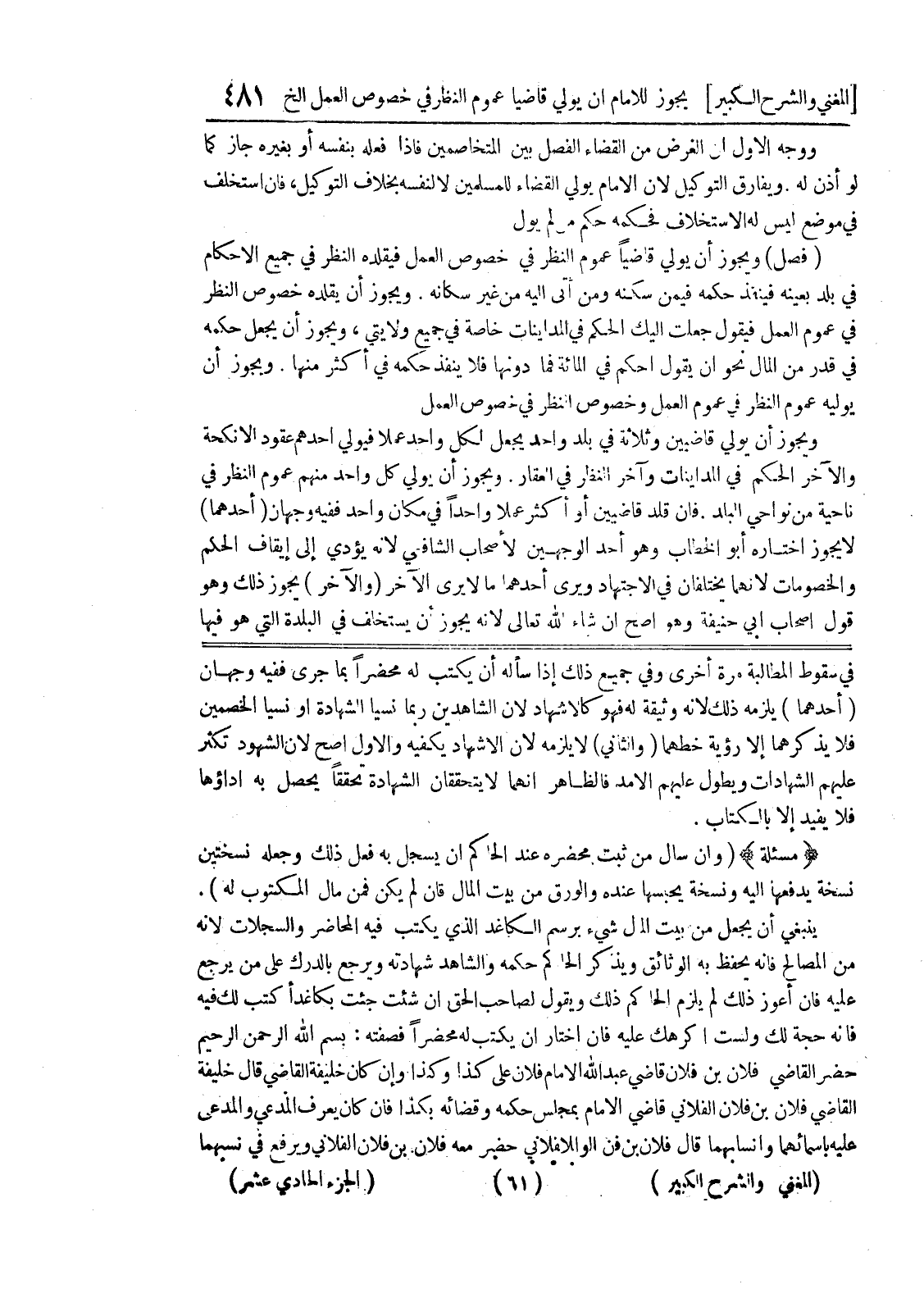 ينبغي أن يجعل من بيت المال شئ برسم الكاغد الذي يكتب فيه المحاضر والسجلات لأنه من المصالح فإنه يحفظ به الوثائق ويذكر الحاكم حكمه والشاهد شهادته ويرجع بالدرك على من يرجع عليه فإن أعوز ذلك لم يلزم الحاكم ذلك ويقول لصاحب الحق إن شئت جئت بكاغد أكتب لك فيه فإنه حجة لك ولست أكرهك عليه فإن اختار أن يكتب له محضراً فصفته: بسم الله الرحمن الرحيم حضر القاضي فلان بن فلان قاضي عبد الله الإمام فلان على كذا وكذا وإن كان خليفة القاضي قال خليفة القاضي فلان بن فلان الفلاني قاضي الإمام بمجلس حكمه وقضائه بكذا فإن كان يعرف المدعي والمدعى عليه بأسمائهما وانسابهما قال فلان بن فن؟ الوللافلاني حضر معه فلان بن فلان الفلاني ويرفع في نسبهما