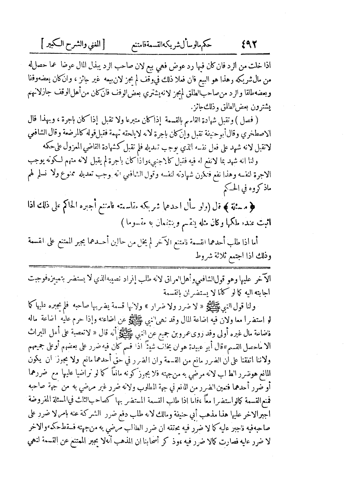 الا ما حصل القسم " قال أبو عبيدة هو أن يخلف شيئاً إذا قسم كان فيه ضرر على بعضهم أو على جميعهم ولأننا اتفقنا على أن الضرر مانع من القسمة وإن الضرر في حق أحدهما مانع ولا يجوز أن يكون المانع هو ضرر الطالب لأنه مرضي به من جهته فلا يجوز كونه مانعاً كما لو تراضيا عليها مع ضررهما أو ضرر أحدهما فتعين الضرر من المانع في جهة المطلوب ولأنه ضرر غير مرضي به من جهة صاحبه فمنع القسمة كما لو استضرا معاً، فأما إذا طلب القسمة المستضر بها كصاحب الثلث في المسألة المفروضة أجبر الآخر عليها هذا مذهب أبي حنيفة ومالك لأنه طلب دفع ضرر الشركة عنه بأمر لا ضرر على صاحبه فيه فأجبر عليه كما لا ضرر فيه يحققه إن ضرر الطالب مرضي به من جهته فسقط حكمه والآخر لا ضرر عليه فصارت كما لا ضرر فيه، وذكر أصحابنا أن المذهب أنه لا يجبر الممتنع عن القسمة لنهي