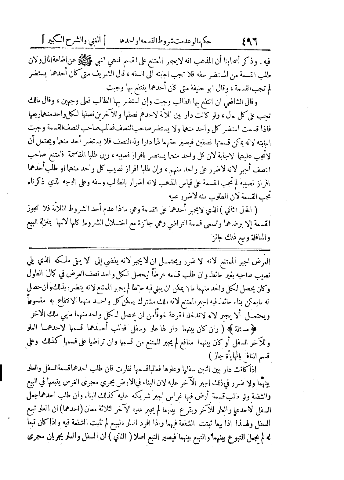العرض أجبر الممتنع لأنه لا ضرر ويحتمل أن لا يجبر لأنه يفضي إلى الا يبقى ملكه الذي يلي نصيب صاحبه بغير حائط وإن طلب قسمه عرضاً ليحصل لكل واحد نصف العرض في كمال الطول وكان يحصل لكل واحد منهما ما لا يمكن أن يبني فيه حائطاً لم يجبر الممتنع لأنه يتضرر بذلك وإن حصل له ما يمكن بناء حائط فيه أجبر الممتنع لأنه ملك مشترك يمكن كل واحد منهما الانتفاع به مقسوماً ويحتمل ألا يجبر لأنه لا تدخله القرعة خوفاً من أن يحصل لكل واحد منهما ما يلي ملك الآخر * (مسألة) * (وإن كان بينهما دار لها علو وسفل فطلب أحدهما قسمها لأحدهما العلو وللآخر السفل أو كان بينهما منافع لم يجبر الممتنع من قسمها وإن تراضيا على قسمها كذلك وعلى قسم المنافع بالمهايأة جاز) إذا كانت دار بين اثنين سفلها وعلوها فطلبا قسمها نظرت فإن طلب أحدهما قسمة السفل والعلو بينهما ولا ضرر في ذلك أجبر الآخر عليه لأن البناء في الأرض يجري مجرى الغرس يتبعها في البيع والشفعة ولو طلب قسمة أرض فيها غراس أجبر شريكه عليه كذلك البناء وإن طلب أحدهما جعل السفل لأحدهما والعلو للآخر ويقرع بينهما لم يجبر عليه الآخر لثلاثة معان (احدهما) أن العلو تبع السفل ولهذا إذا بيعا ثبتت الشفعة فيهما وإذا افرد العلو بالبيع لم تثبت الشفعة فيه وإذا كان تبعا له لم يجعل المتبوع بينهما والتبع بينهما فيصير التبع أصلاً (الثاني) إن السفل والعلو يجريان مجرى