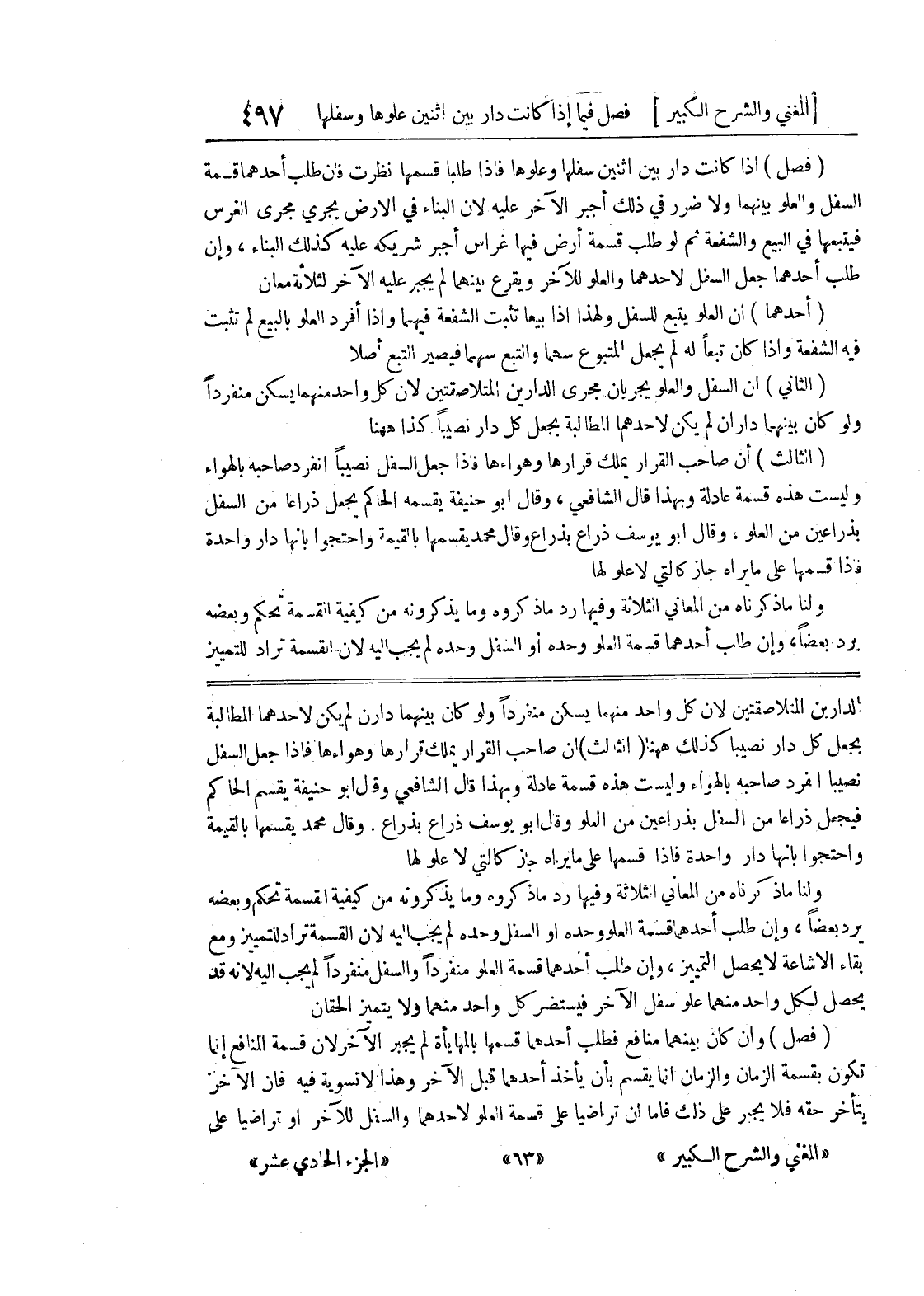 الدارين المتلاصقتين لأن كل واحد منهما يسكن منفرداً ولو كان بينهما دارن لم يكن لأحدهما المطالبة يجعل كل دار نصيباً كذلك ههنا (الثالث) إن صاحب القرار يملك قرارها وهواءها فإذا جعل السفل نصيبا للفرد صاحبه بالهواء وليست هذه قسمة عادلة وبهذا قال الشافعي وقال أبو حنيفة يقسم الحاكم فيجعل ذراعاً من السفل بذراعين من العلو وقال أبو يوسف ذراع بذراع.