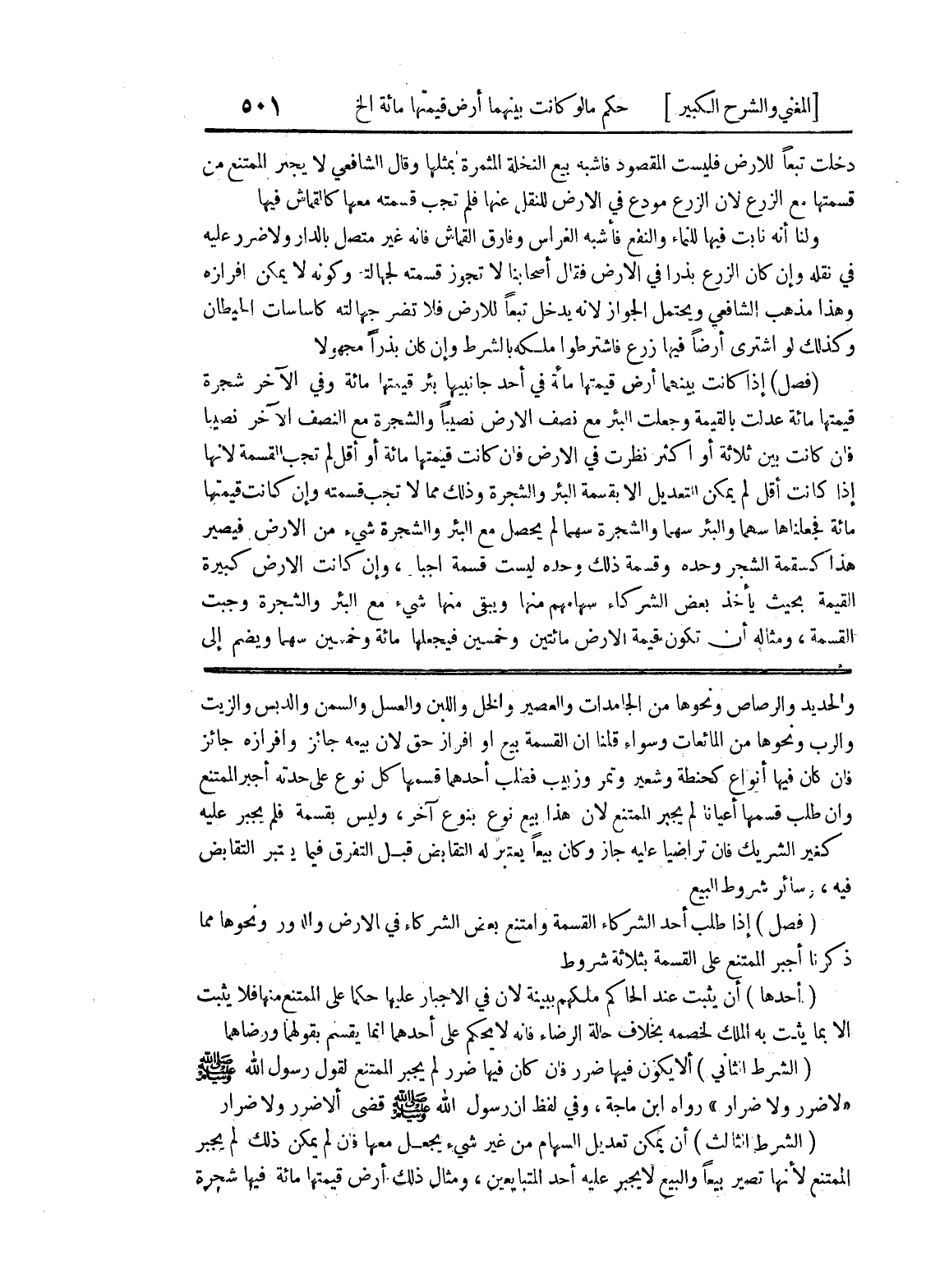 (الشرط الثاني) ألا يكون فيها ضرر فإن كان فيها ضرر لم يجبر الممتنع لقول رسول الله صلى الله عليه وسلم " لا ضرر ولا ضرار " رواه ابن ماجه، وفي لفظ أن رسول الله صلى الله عليه وسلم قضى ألا ضرر ولا ضرار (الشرط الثالث) أن يمكن تعديل السهام من غير شئ يجعل معها فإن لم يكن ذلك لم يجبر الممتنع لأنها تصير بيعاً والبيع لا يجبر عليه أحد المتبايعين، ومثال ذلك ارض قيمتها مائة فيها شجرة