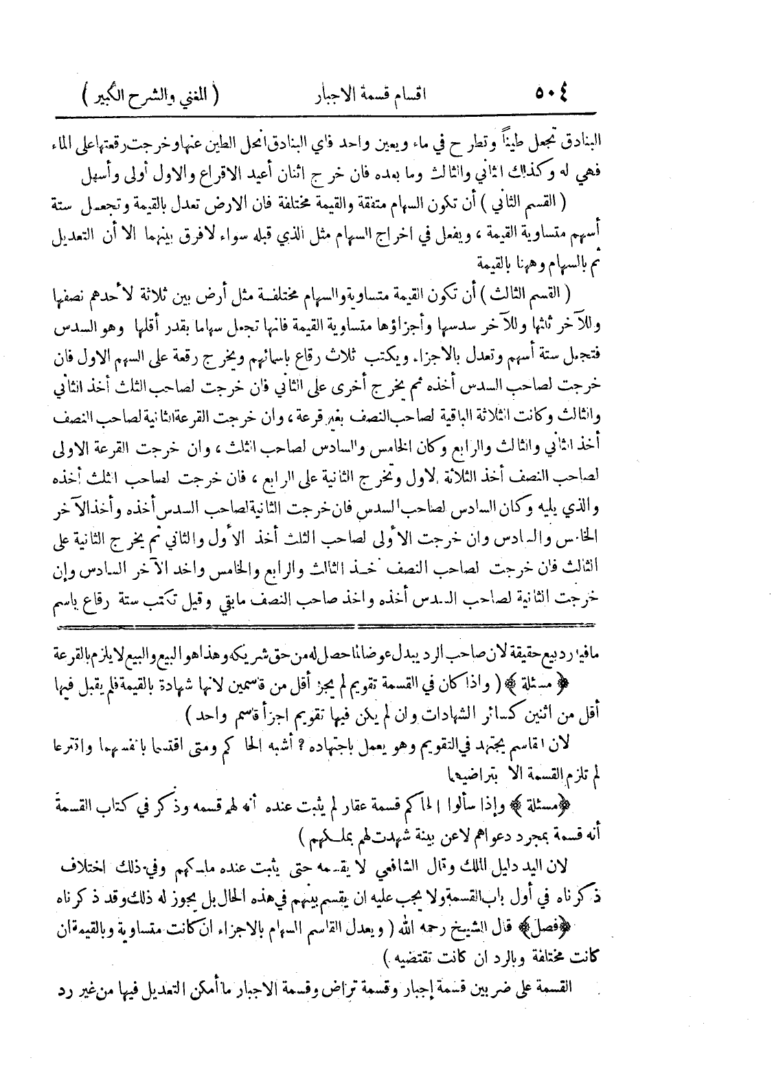 ما فيه رد بيع حقيقة لأن صاحب الرد يبدل عوضاً لما حصل له من حق شريكه وهذا هو البيع والبيع لا يلزم بالقرعة * (مسألة) * (وإذا كان في القسمة تقويم لم يجز أقل من قاسمين لأنها شهادة بالقيمة فلم يقبل فيها أقل من اثنين كسائر الشهادات وإن لم يكن فيها تقويم أجزأ قاسم واحد) لأن القاسم يجتهد في التقويم وهو يعمل باجتهاده؟ أشبه الحاكم ومتى اقتسما بأنفسهما واقترعا لم تلزم القسمة إلا بتراضيهما * (مسألة) * (وإذا سألوا الحاكم قسمة عقار لم يثبت عنده أنه لهم قسمه وذكر في كتاب القسمة أنه قسمة بمجرد دعواهم لا عن بينة شهدت لهم بملكهم) لأن اليد دليل الملك وقال الشافعي لا يقسمه حتى يثبت عنده ملكهم وفي ذلك اختلاف ذكرناه في أول باب القسمة ولا يجب عليه أن يقسم بينهم في هذه الحال بل يجوز له ذلك وقد ذكرناه