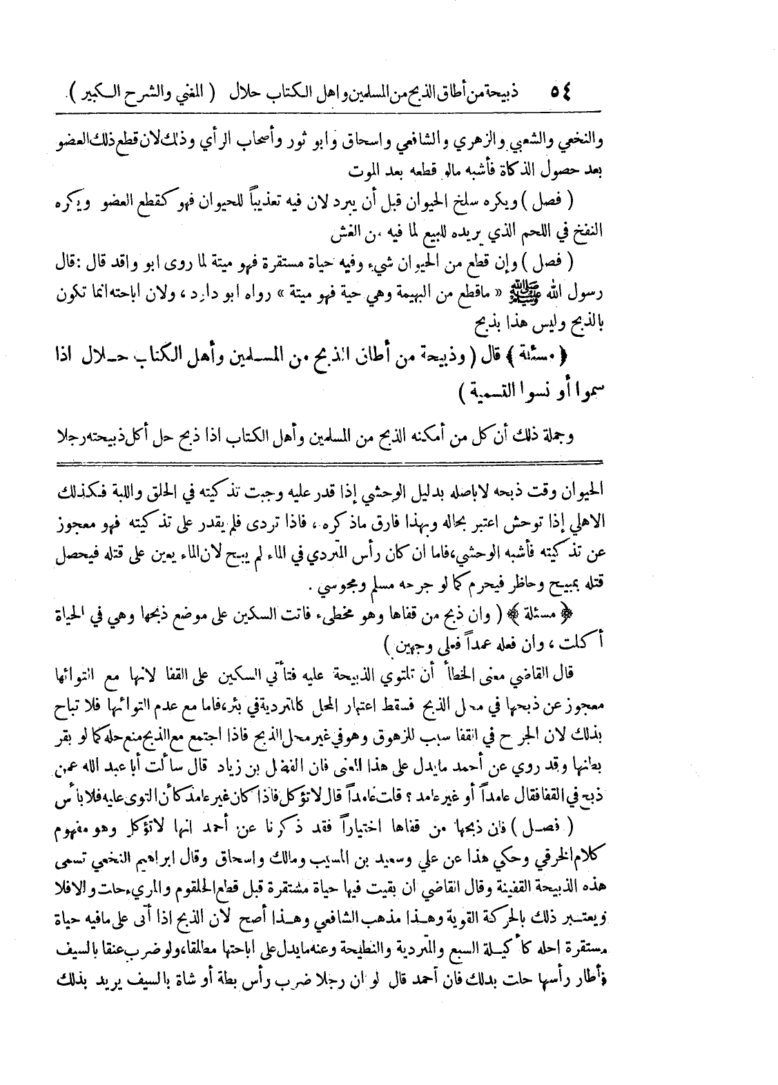 * (مسألة) * (وإن ذبح من قفاها وهو مخطئ فأتت السكين على موضع ذبحها وهي في الحياة أكلت، وإن فعله عمداً فعلى وجهين) قال القاضي معنى الخطأ أن تلتوي الذبيحة عليه فتأتي السكين على القفا لأنها مع التوائها معجوز عن ذبحها في محل الذبح فسقط اعتبار المحل كالمتردية في بئر، فأما مع عدم التوائها فلا تباح بذلك لأن الجرح في القفا سبب للزهوق وهو في غير محل الذبح فإذا اجتمع مع الذبح منع حله كما لو بقر بطنها وقد روي عن أحمد ما يدل على هذا المعنى فإن الفضل بن زياد قال سألت أبا عبد الله عمن ذبح في القفا فقال عامداً أو غير عامد؟ قلت عامداً قال لا تؤكل فإذا كان غير عامد كأن التوى عليه فلا بأس (فصل) فإن ذبحها من قفاها اختياراً فقد ذكرنا عن أحمد أنها لا تؤكل وهو مفهوم كلام الخرقي وحكي هذا عن علي وسعيد بن المسيب ومالك واسحاق وقال ابراهيم والنخعي تسمى هذه الذبيحة القفينة وقال القاضي إن بقيت فيها حياة مستقرة قبل قطع الحلقوم والمرئ حلت وإلا فلا ويعتبر ذلك بالحركة القوية وهذا مذهب الشافعي وهذا أصح لأن الذبح إذا أتى على ما فيه حياة