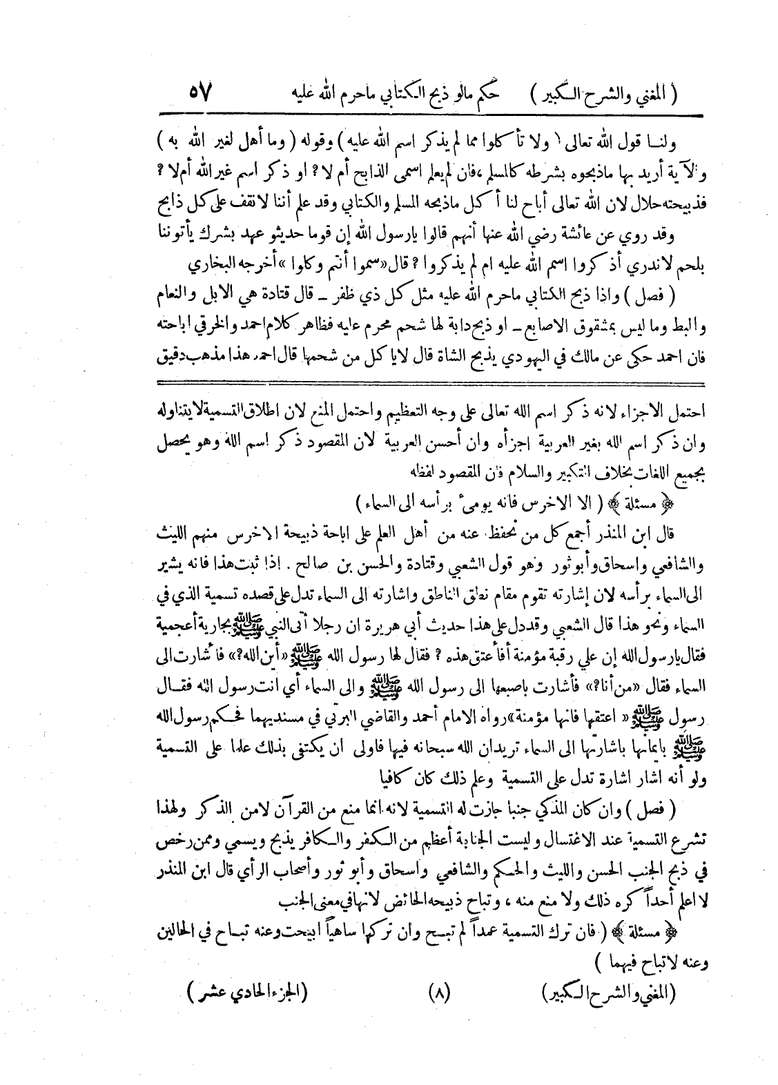 إذا ثبت هذا فإنه يشير إلى السماء برأسه لأن إشارته تقوم مقام نطق الناطق وإشارته إلى السماء تدل على قصده تسمية الذي في السماء ونحو هذا قال الشعبي وقد دل على هذا حديث أبي هريرة أن رجلاً أتى النبي صلى الله عليه وسلم بجارية أعجمية فقال يا رسول الله إن علي رقبة مؤمنة أفأعتق هذه؟ فقال لها رسول الله صلى الله عليه وسلم " أين الله؟ " فأشارت إلى السماء فقال " من أنا؟ " فأشارت بأصبعها إلى رسول الله صلى الله عليه وسلم وإلى السماء أي أنت رسول الله فقال رسول الله صلى الله عليه وسلم " أعتقها فإنها مؤمنة " رواه الإمام أحمد والقاضي البرتي في مسنديهما فحكم رسول الله صلى الله عليه وسلم وبايمانها باشارتها إلى السماء تريد أن الله سبحانه فيها فأولى أن يكتفى بذلك علماً على التسمية ولو أنه أشار إشارة تدل على التسمية وعلم ذلك كان كافياً (فصل) وإن كان المذكي جنبا جازت له التسمية لأنه إنما منع من القرآن لا من الذكر ولهذا تشرع التسمية عند الاغتسال وليست الجناية أعظم من الكفر والكافر يذبح ويسمي وممن رخص في ذبح الجنب الحسن والليث والحكم والشافعي واسحاق وأبو ثور وأصحاب الرأي قال إبن المنذر لا أعلم أحداً كره ذلك ولا منع منه، وتباح ذبيحة الحائض لأنها في معنى الجنب * (مسألة) * (فإن ترك التسمية عمداً لم تبح وإن تركها ساهياً أبيحت وعنه تباح في الحالين وعنه لا تباح فيهما)