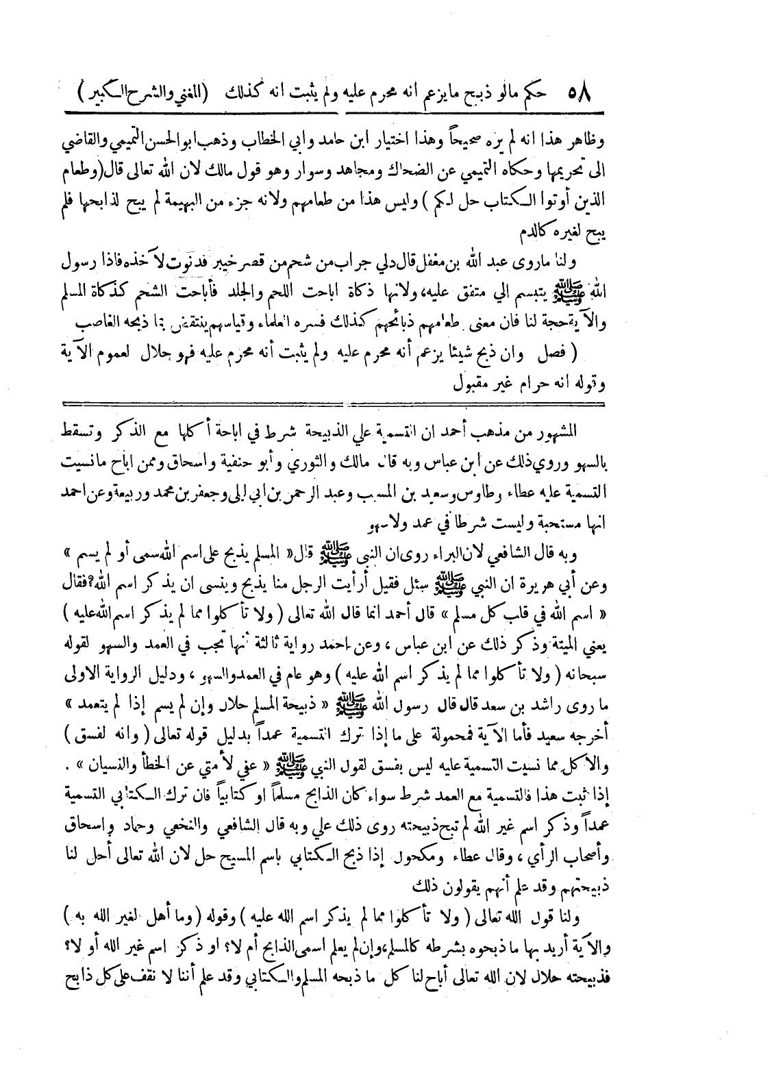 إذا ثبت هذا فالتسمية مع العمد شرط سواء كان الذابح مسلماً أو كتابياً فإن ترك الكتابي التسمية عمداً وذكر اسم غير الله لم تبح ذبيحته روى ذلك علي وبه قال الشافعي والنخعي وحماد واسحاق وأصحاب الرأي، وقال عطاء ومكحول إذا ذبح الكتابي باسم المسيح حل لأن الله تعالى أحل لنا ذبيحتهم وقد علم أنهم يقولون ذلك ولنا قول الله تعالى (ولا تأكلوا مما لم يذكر اسم الله عليه) وقوله (وما أهل لغير الله به) والآية أريد بها ما ذبحوه بشرطه كالمسلم، وإن لم يعلم اسمى الذابح أم لا؟ أو ذكر اسم غير الله أو لا؟ فذبيحته حلال لأن الله تعالى أباح لنا كل ما ذبحه المسلم والكتابي وقد علم أننا لا نقف على كل ذابح