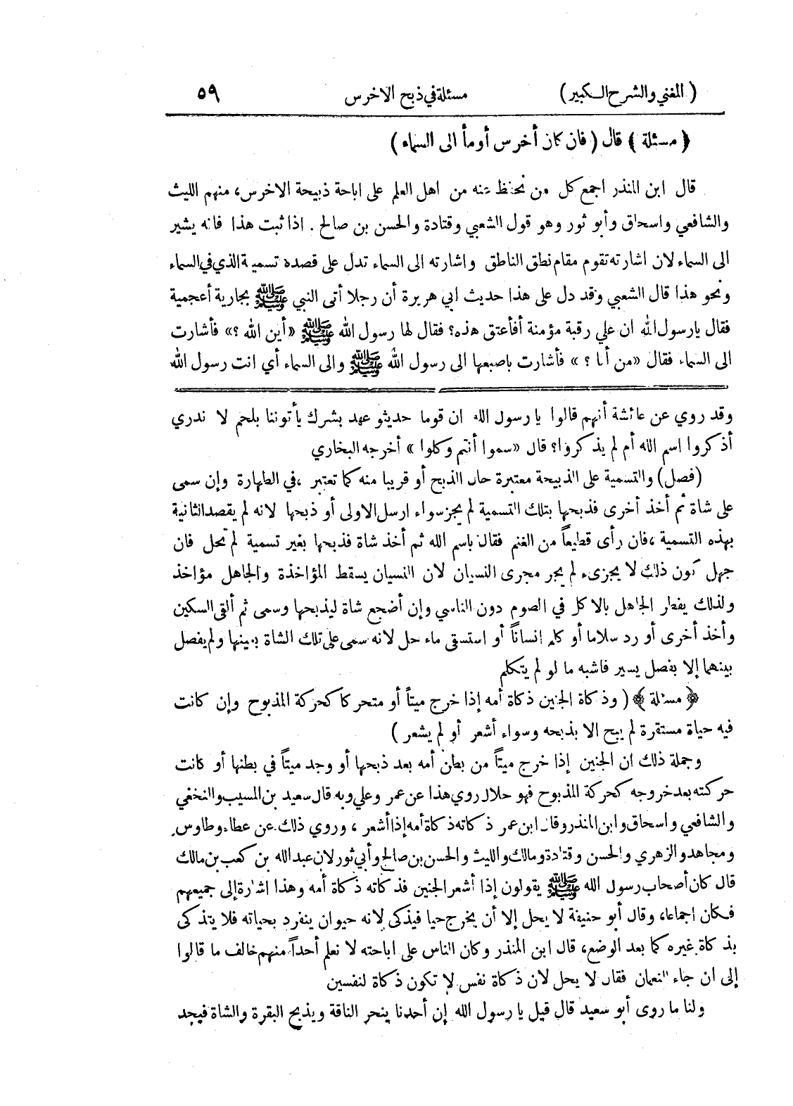 (فصل) والتسمية على الذبيحة معتبرة حال الذبح أو قريبا منه كما تعتبر، في الطهارة وإن سمى على شاة ثم أخذ أخرى فذبحها بتلك التسمية لم يجز سواء أرسل الأولى أو ذبحها لأنه لم يقصد الثانية بهذه التسمية، فإن رأى قطيعاً من الغنم فقال باسم الله ثم أخذ شاة فذبحها بغير تسمية لم تحل فإن جهل كون ذلك لا يجزئ لم يجر مجرى النسيان لأن النسيان يسقط المؤاخذة والجاهل مؤاخذ ولذلك يفطر الجاهل بالأكل في الصوم دون الناسي وإن أضجع شاة ليذبحها وسمى ثم ألقى السكين وأخذ اخرى أو رد سلاما أو كلم إنساناً أو استسقى ماء حل لأنه سمى على تلك الشاة بعينها ولم يفصل بينهما إلا بفصل يسير فأشبه ما لو لم يتكلم * (مسألة) * (وذكاة الجنين ذكاة أمه إذا خرج ميتاً أو متحركاً كحركة المذبوح وإن كانت فيه حياة مستقرة لم يبح إلا بذبحه وسواء أشعر أو لم يشعر) وجملة ذلك أن الجنين إذا خرج ميتاً من بطن أمه بعد ذبحها أو وجد ميتاً في بطنها أو كانت حركته بعد خروجه كحركة المذبوح فهو حلال روي هذا عن عمر وعلي وبه قال سعيد بن المسيب والنخعي والشافعي وإسحاق وابن المنذر وقال ابن عمر ذكاته ذكاة أمه إذا أشعر، وروي ذلك عن عطاء وطاوس ومجاهد والزهري والحسن وقتادة ومالك والليث والحسن بن صالح وأبي ثور لأن عبد الله بن كعب بن مالك قال كان أصحاب رسول الله صلى الله عليه وسلم يقولون إذا أشعر الجنين فذكاته ذكاة أمه وهذا إشارة إلى جميعهم فكان إجماعا، وقال أبو حنيفة لا يحل إلا أن يخرج حياً فيذكى لأنه حيوان ينفرد بحياته فلا يتذكى بذكاة غيره كما بعد الوضع، قال إبن المنذر وكان الناس على إباحته لا نعلم أحداً منهم خالف ما قالوا إلى أن جاء النعمان فقال لا يحل لأن ذكاة نفس لا تكون ذكاة لنفسين ولنا ما روى أبو سعيد قال قيل يا رسول الله إن أحدنا ينحر الناقة ويذبح البقرة والشاة فيجد