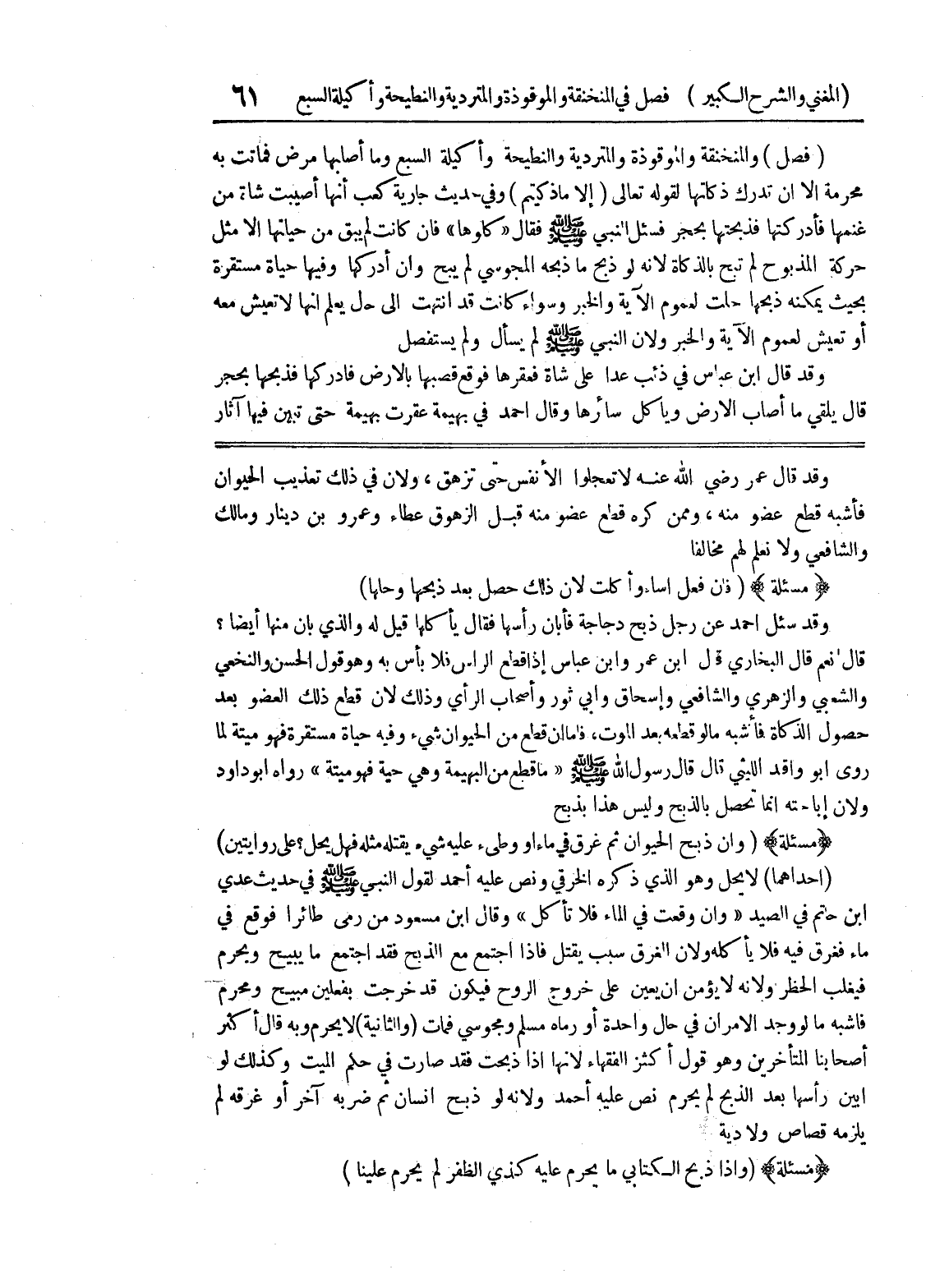 قال نعم قال البخاري قال ابن عمر وابن عباس إذا قطع الراس فلا بأس به وهو قول الحسن والنخعي والشعبي والزهري والشافعي وإسحاق وأبي ثور وأصحاب الرأي وذلك لأن قطع ذلك العضو بعد حصول الذكاة فأشبه ما لو قطعه بعد الموت، فأما إن قطع من الحيوان شئ وفيه حياة مستقرة فهو ميتة لما روى أبو واقد الليثي قال قال رسول الله صلى الله عليه وسلم " ما قطع من البهيمة وهي حية فهو ميتة " رواه أبو داود ولأن إباحته إنما تحصل بالذبح وليس هذا بذبح * (مسألة) * (وإن ذبح الحيوان ثم غرق في ماء أو وطئ عليه شئ يقتله مثله فهل يحل؟ على روايتين) (إحداهما) لا يحل وهو الذي ذكره الخرقي ونص عليه أحمد لقول النبي صلى الله عليه وسلم في حديث عدي ابن حاتم في الصيد " وإن وقعت في الماء فلا تأكل " وقال ابن مسعود من رمى طائرا فوقع في ماء فغرق فيه فلا يأكله ولأن الغرق سبب يقتل فإذا اجتمع مع الذبح فقد اجتمع ما يبيح ويحرم فيغلب الحظر ولأنه لا يؤمن أن يعين على خروج الروح فيكون قد خرجت بفعلين مبيح ومحرم فأشبه ما لو وجد الأمران في حال واحدة أو رماه مسلم ومجوسي فمات (والثانية) لا يحرم وبه قال أكثر أصحابنا المتأخرين وهو قول أكثر الفقهاء لأنها إذا ذبحت فقد صارت في حكم الميت وكذلك لو أبين رأسها بعد الذبح لم يحرم نص عليه أحمد ولأنه لو ذبح إنسان ثم ضربه آخر أو غرقه لم يلزمه قصاص ولا دية * (مسألة) * (وإذا ذبح الكتابي ما يحرم عليه كذي الظفر لم يحرم علينا)